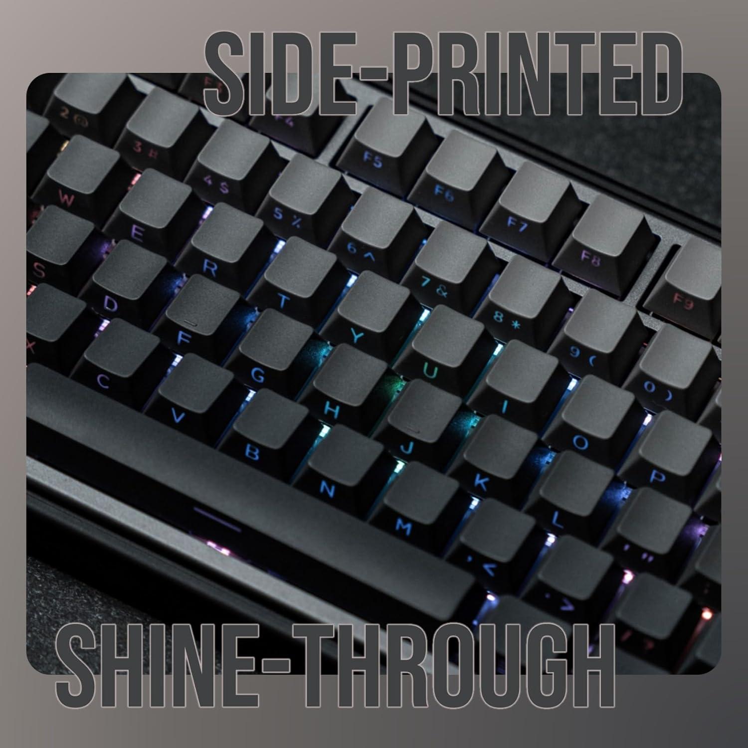 【Side-printed and Shine-through】A distinctive feature of this keycap set is the side-printed legends. Rather than being printed on the top, the legends appear on the front side of each keycap. This design helps protect the legends from fading due to finger contact during typing or gaming. Additionally, the side-printing contributes to a minimalist and uncluttered look on the keyboard, appealing to those who value a sleek and modern aesthetic.