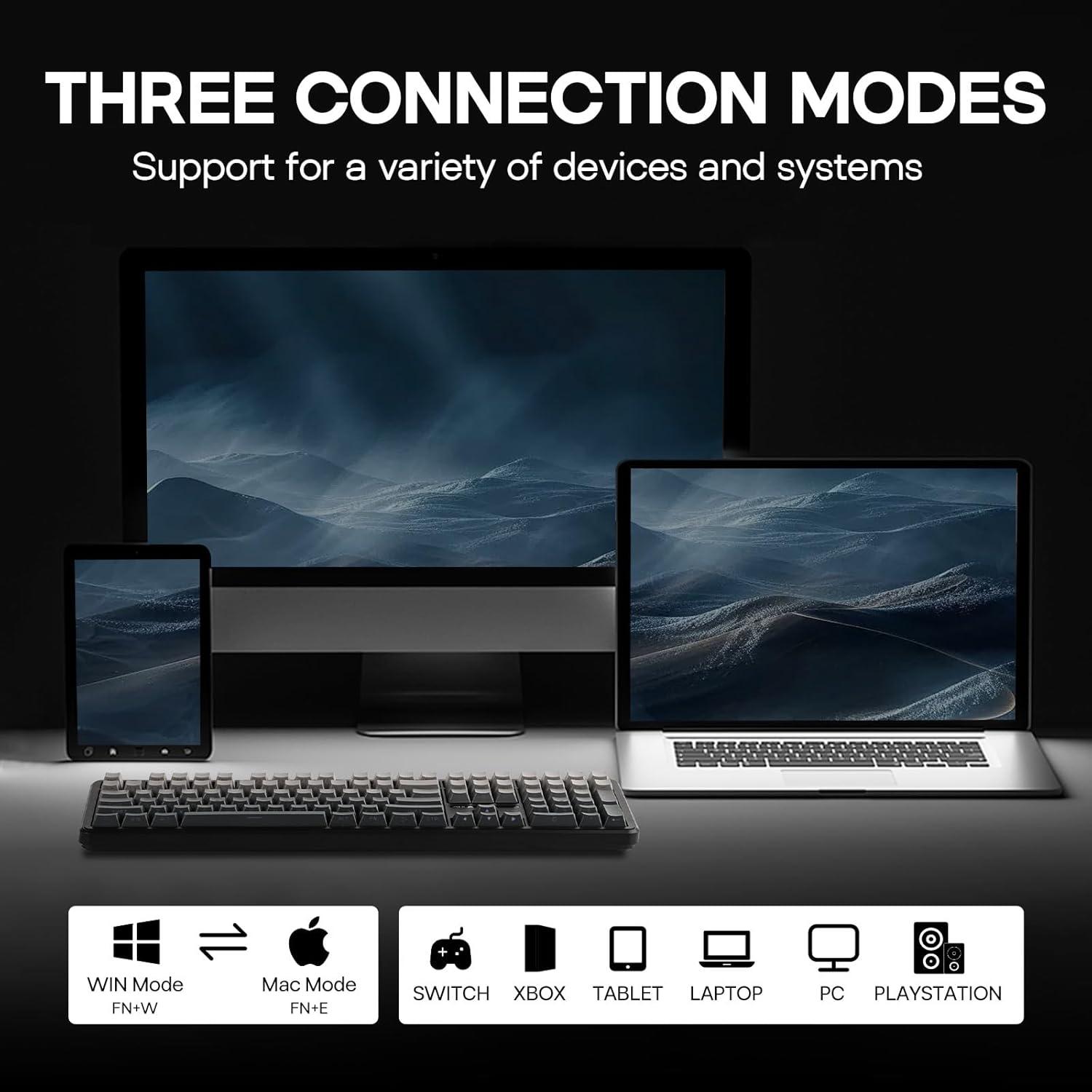 Wireless Keyboard with Limitless Compatibility: Packed with 4000mAh rechargeable batteries, double the power average gaming keyboard offers, F108 Wireless Keyboard grants up to 100 hours of continuous gameplay at peak performance with backlight off. Its versatile Bluetooth mode offers swift transaction from PC, Mac Laptop to Android Tablet, while the 2.4GHz wireless and USB Cable mode promise competitive-level stability and responsiveness with 1000Hz polling rate