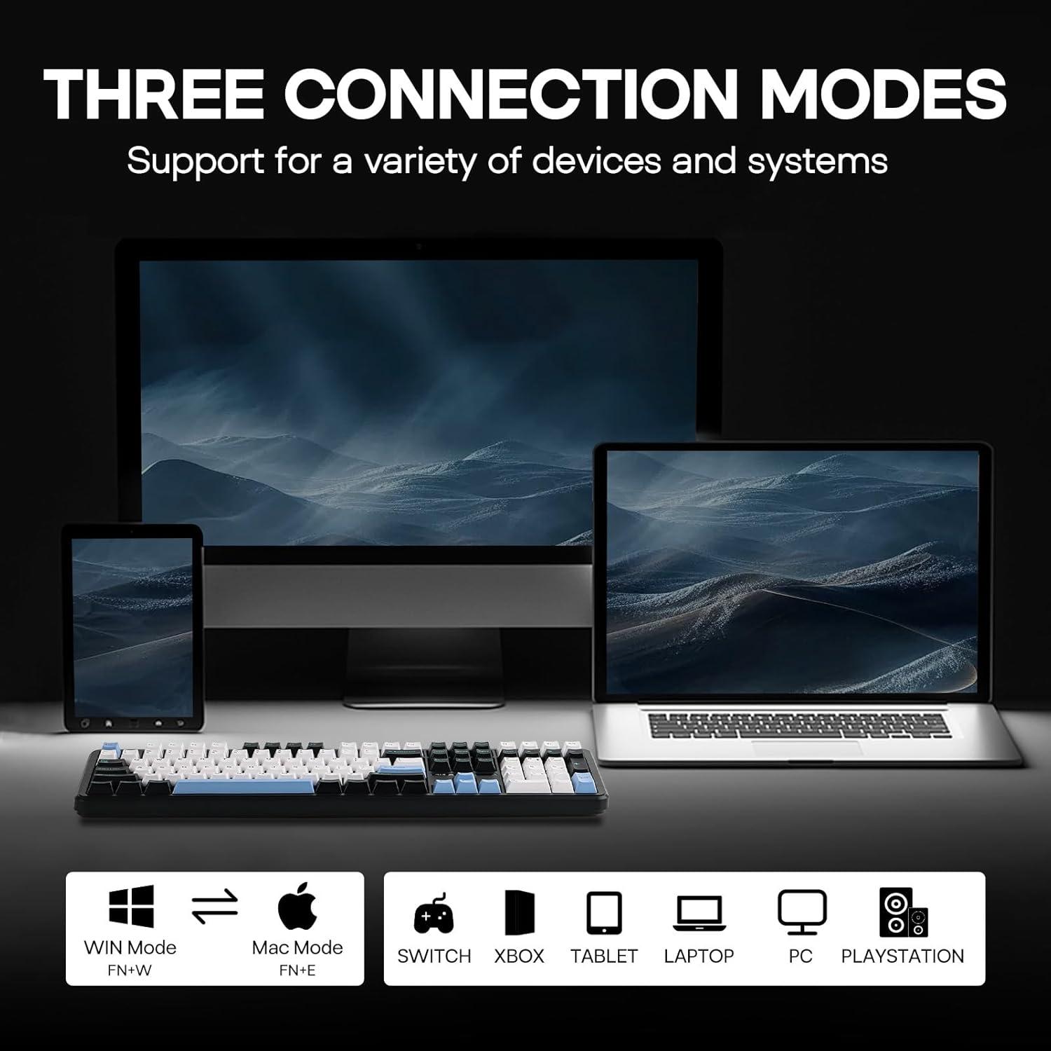 Wireless Keyboard with Limitless Compatibility: Packed with 4000mAh rechargeable batteries, double the power average gaming keyboard offers, F108 Wireless Keyboard grants up to 100 hours of continuous gameplay at peak performance with backlight off. Its versatile Bluetooth mode offers swift transaction from PC, Mac Laptop to Android Tablet, while the 2.4GHz wireless and USB Cable mode promise competitive-level stability and responsiveness with 1000Hz polling rate