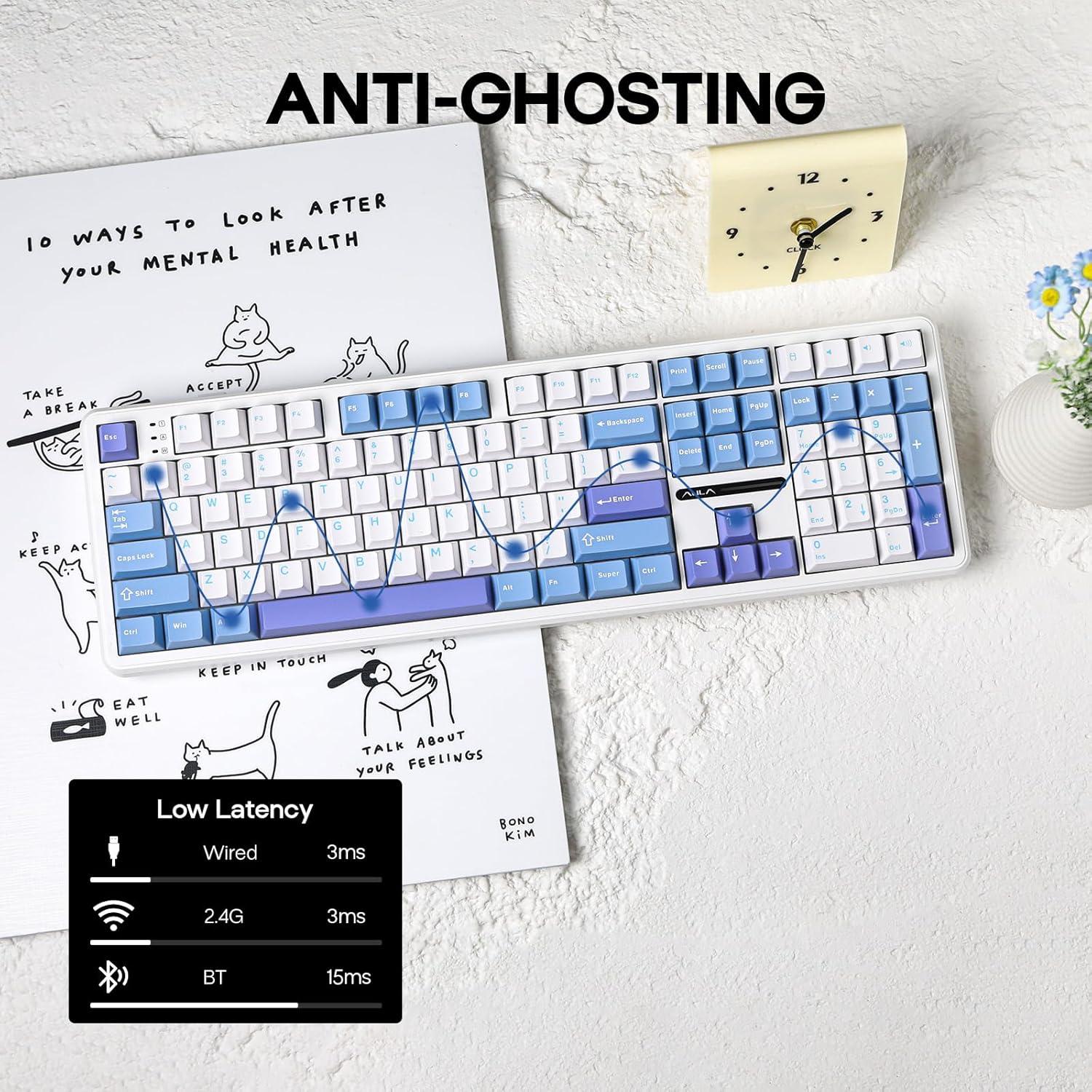 100% in Size, Performance and Comforts: Meet the 100% full size variation of the EPOMAKER X AULA F75, the F108 Mechanical keyboard that offers the same creamy sound and unparalleled performance as F75 but in upgraded full-size layout. The 108 anti-ghosting keys deliver accuracy and greater possibilities in configuration and control, which makes them ideal for multitasking and fast response in gaming and the office. While the 2-stage kickstand, low front height and cherry profile keycaps rid you of finger fatigue and wrist strain for a pain-free day of work