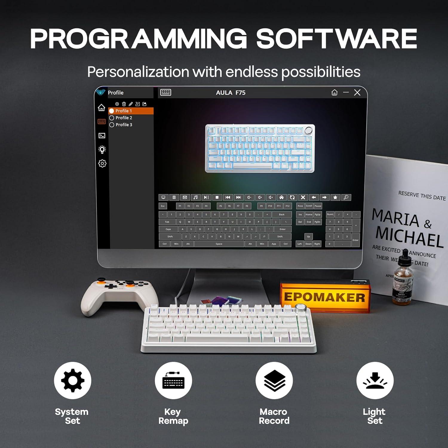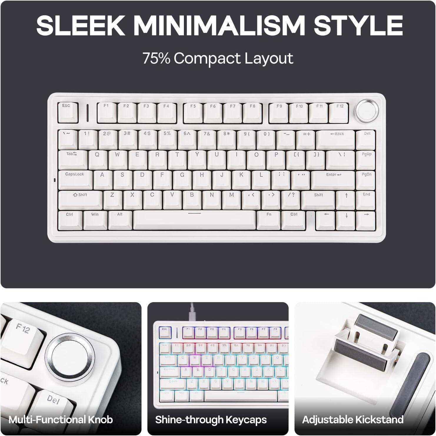 80 Keys, 75% Layout with Convenient Knob: The F75-Wired Mechanical Keyboard features a compact 80-key, 75% layout that maximizes your desk space while keeping all essential keys within easy reach. The added knob offers quick and convenient control for volume adjustments or media playback, allowing for a seamless user experience whether you're typing, gaming, or listening to music.