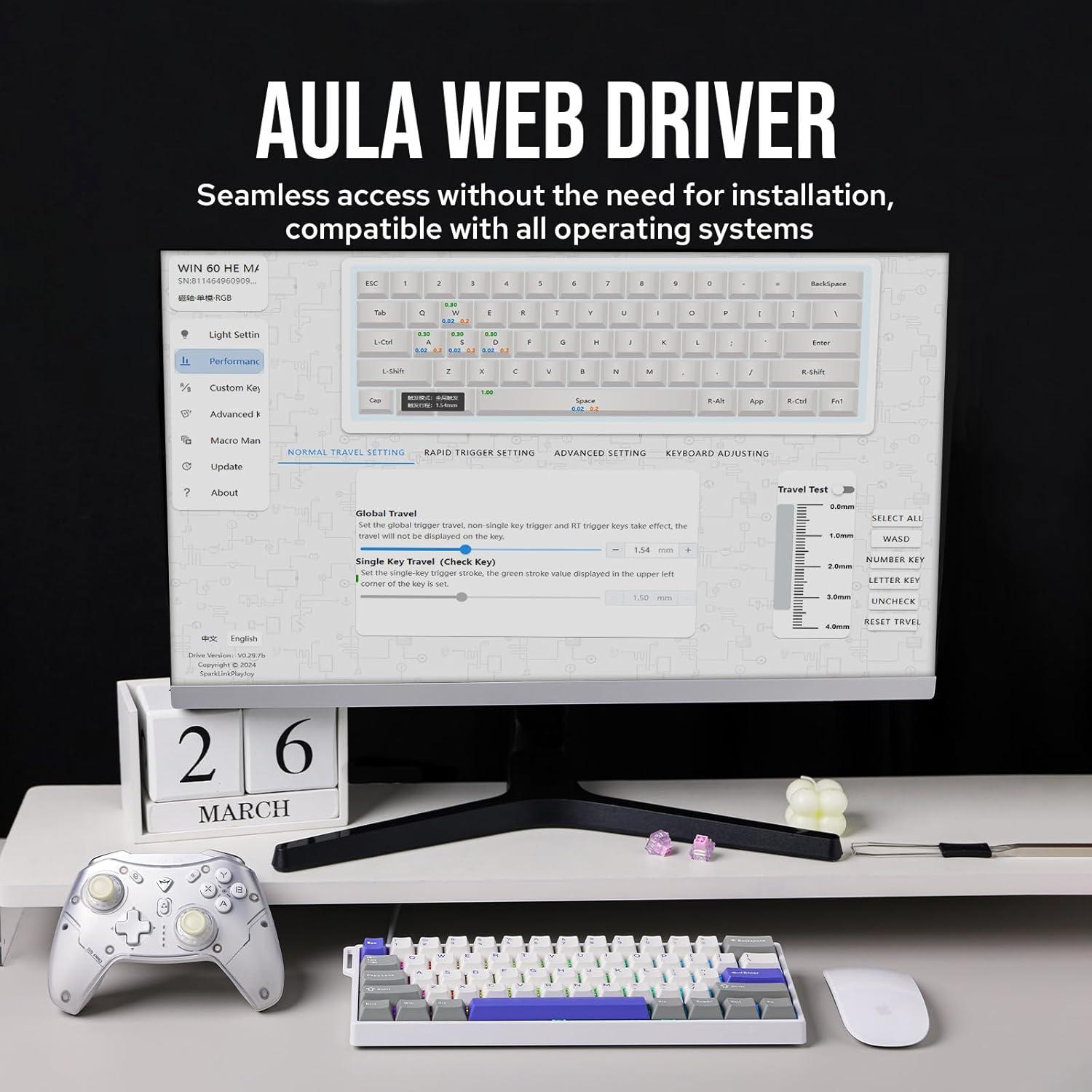 Online WEB Driver: The WIN60 HE’s web driver simplifies settings and parameter adjustments for users of all levels. All system performance parameters are fully customizable, with real-time visual feedback, including per-key rapid-trigger and sensitivity adjustments on the keyboard preview.