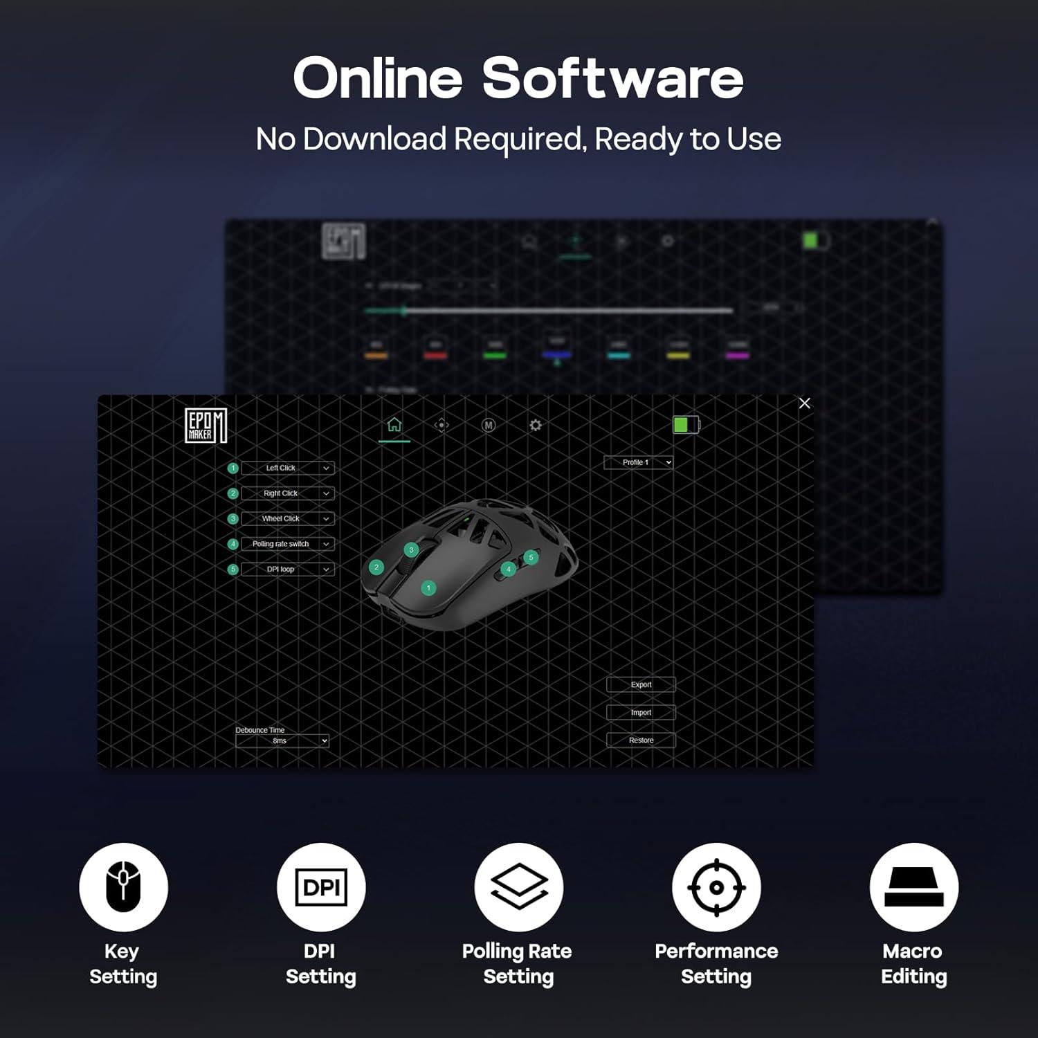 Programmable Buttons & Online Software: Through our convenient online software, you can easily access its features without downloading an app. The mouse is equipped with four programmable buttons (the left mouse button cannot be customized), allowing you to tailor your gaming experience to your personal needs. You can set up macros and shortcuts to optimize operations, enhance gaming efficiency, and gain a tactical advantage during battles. This design aims to improve the overall gaming experience, making each of your gaming sessions smoother and more flexible.