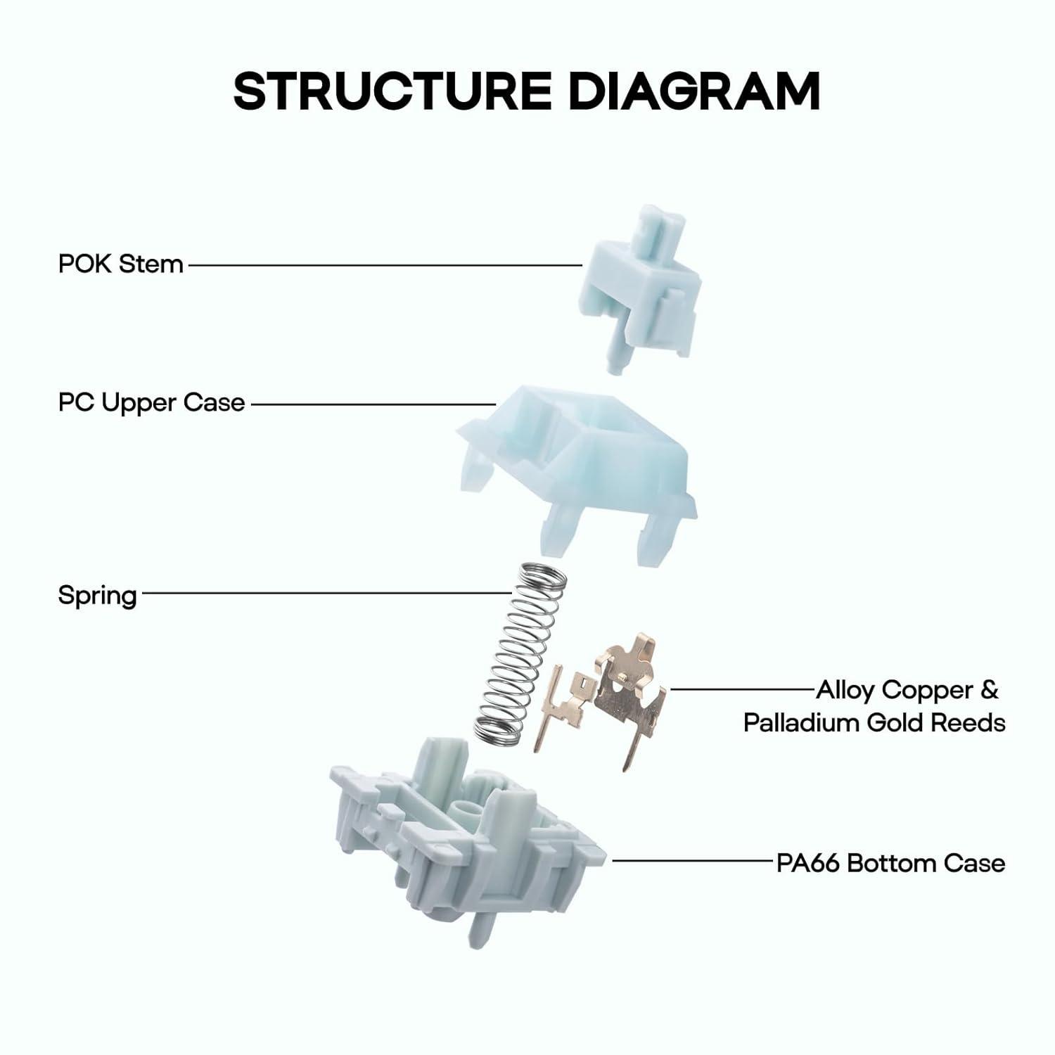 Premium Material Construction: Crafted with a POK stem, PC upper housing, and PA66 bottom housing, the Creamy Jade Switch is built to last. These high-quality materials ensure minimal wobble, enhancing stability and providing a consistent feel with every keystroke. The durable construction also contributes to a clean, satisfying sound profile that will elevate your typing experience.