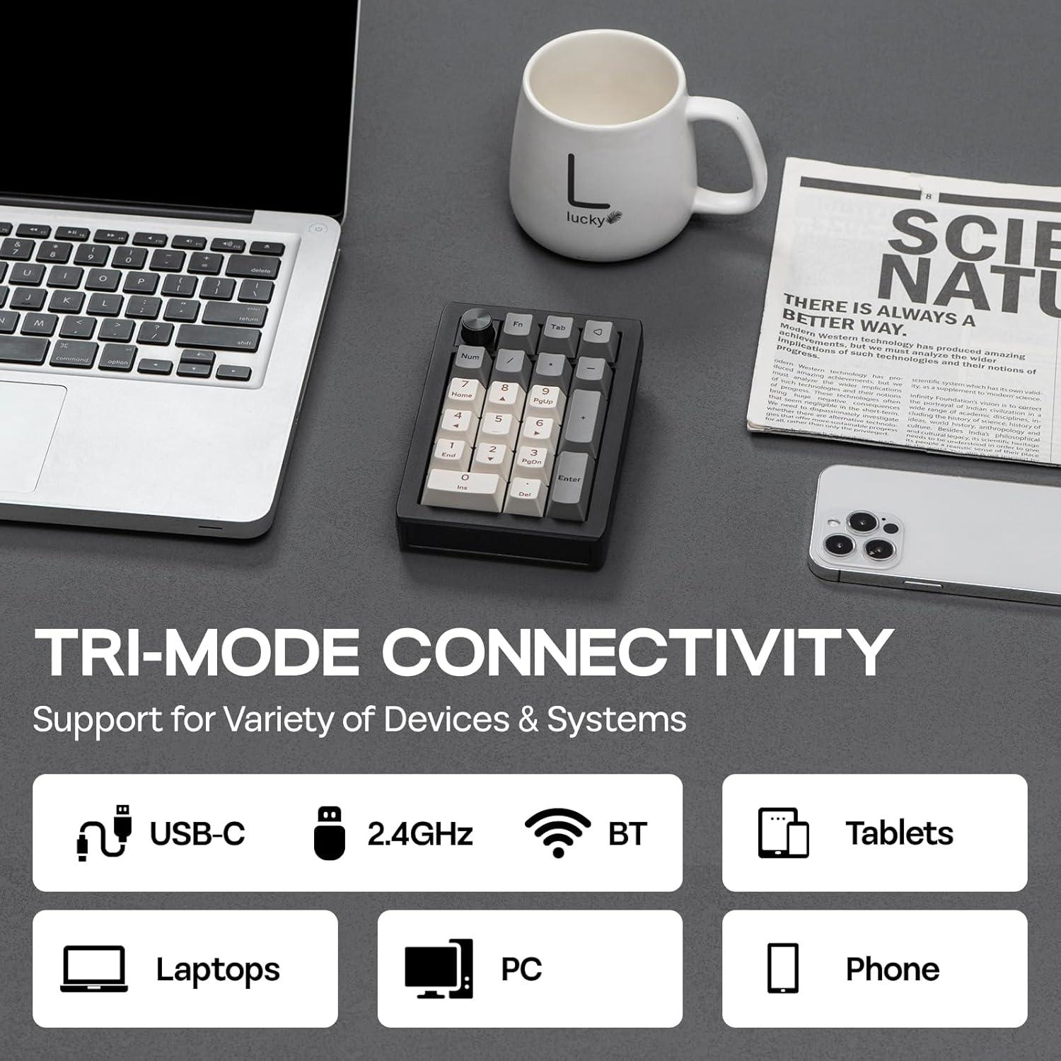 Triple Modes&1000mAh Large Capacity Battery: The EK21 offers exceptional versatility with its triple connectivity options. Choose from wired, BT, or 2.4GHz wireless modes to suit your preferences and enhance your productivity. This numpad is not just about connectivity; it also features a robust 1000mAh battery capacity, providing you with extended usage time without the inconvenience of frequent recharging. Enjoy consistent performance and stay focused on your tasks throughout the day, knowing that the EK21 is designed to keep up with your demands. Whether you're working at your desk or on the go, this device ensures seamless operation tailored to your needs