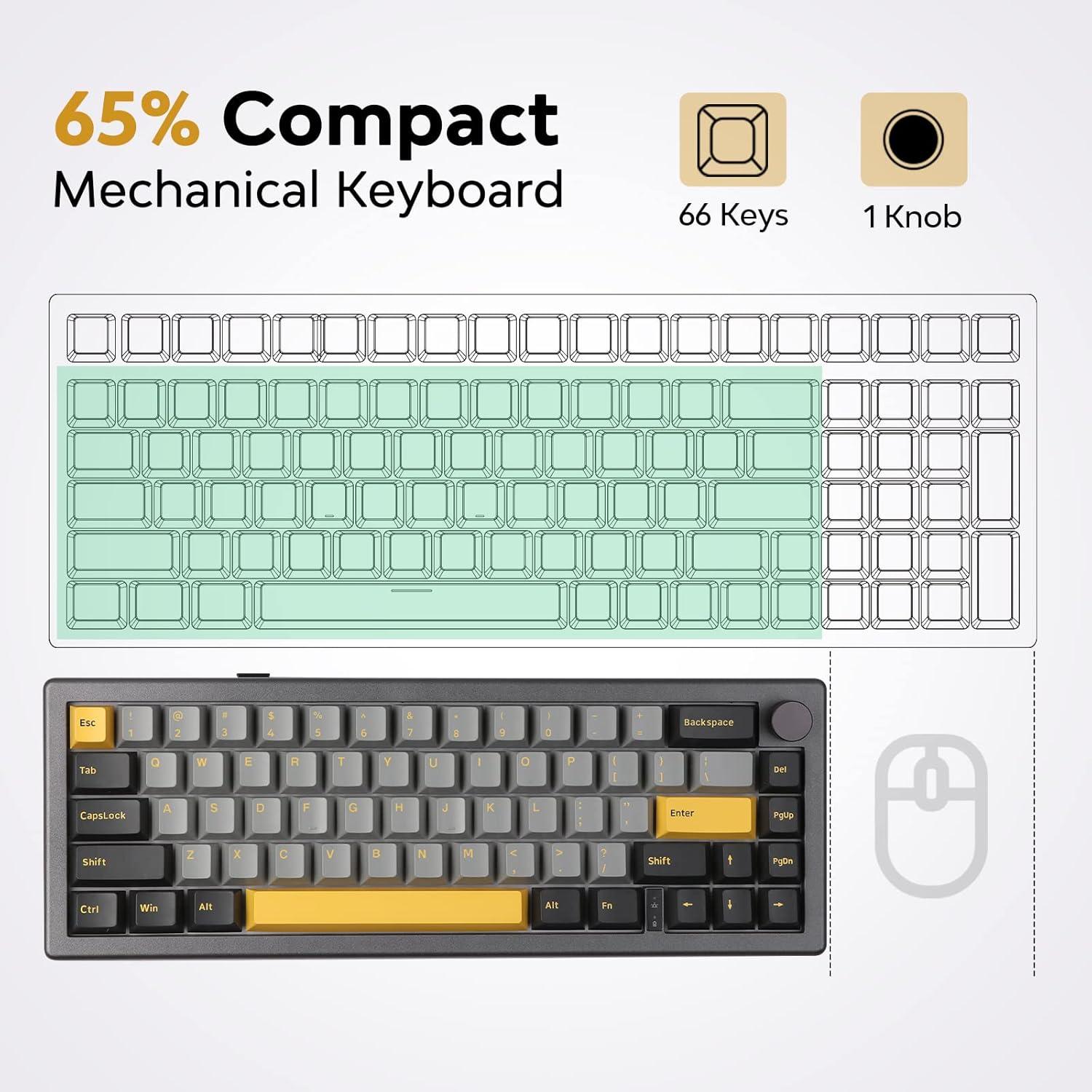 【65% Compact Layout】The EK68 compact keyboard is ergonomically designed to provide comfort during long gaming sessions. Designed in a favored 65% layout to maximize the function while not wasting a minimum of space. Its compact size and lightweight construction make it easy to carry, while the durable keys are built to withstand intense gaming sessions without compromising performance. Housing 66 keys and one knob, EK68 will surely be beyond your expectation with the hot swappable socket and programmable software, and amazing RGB backlights.
