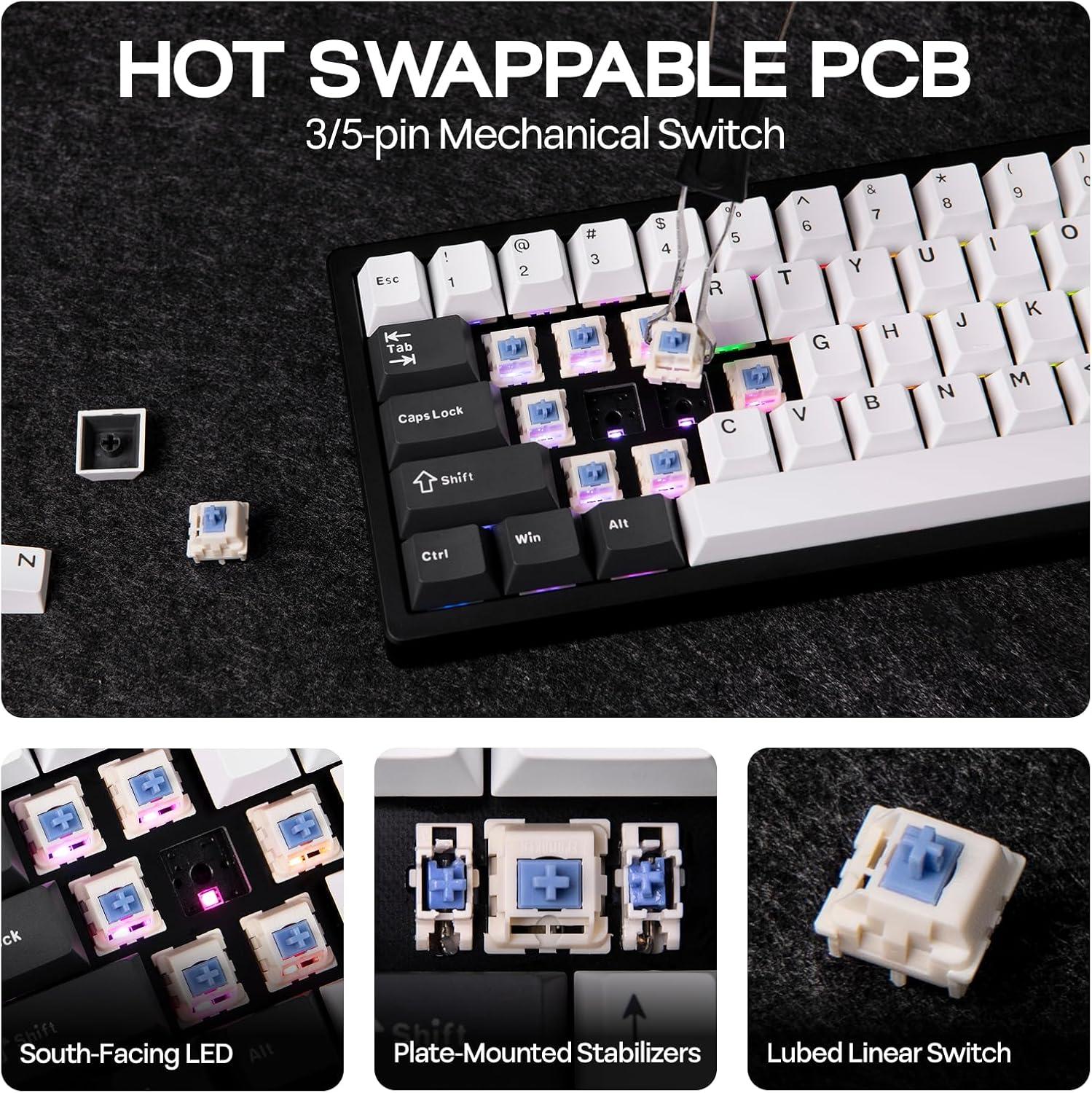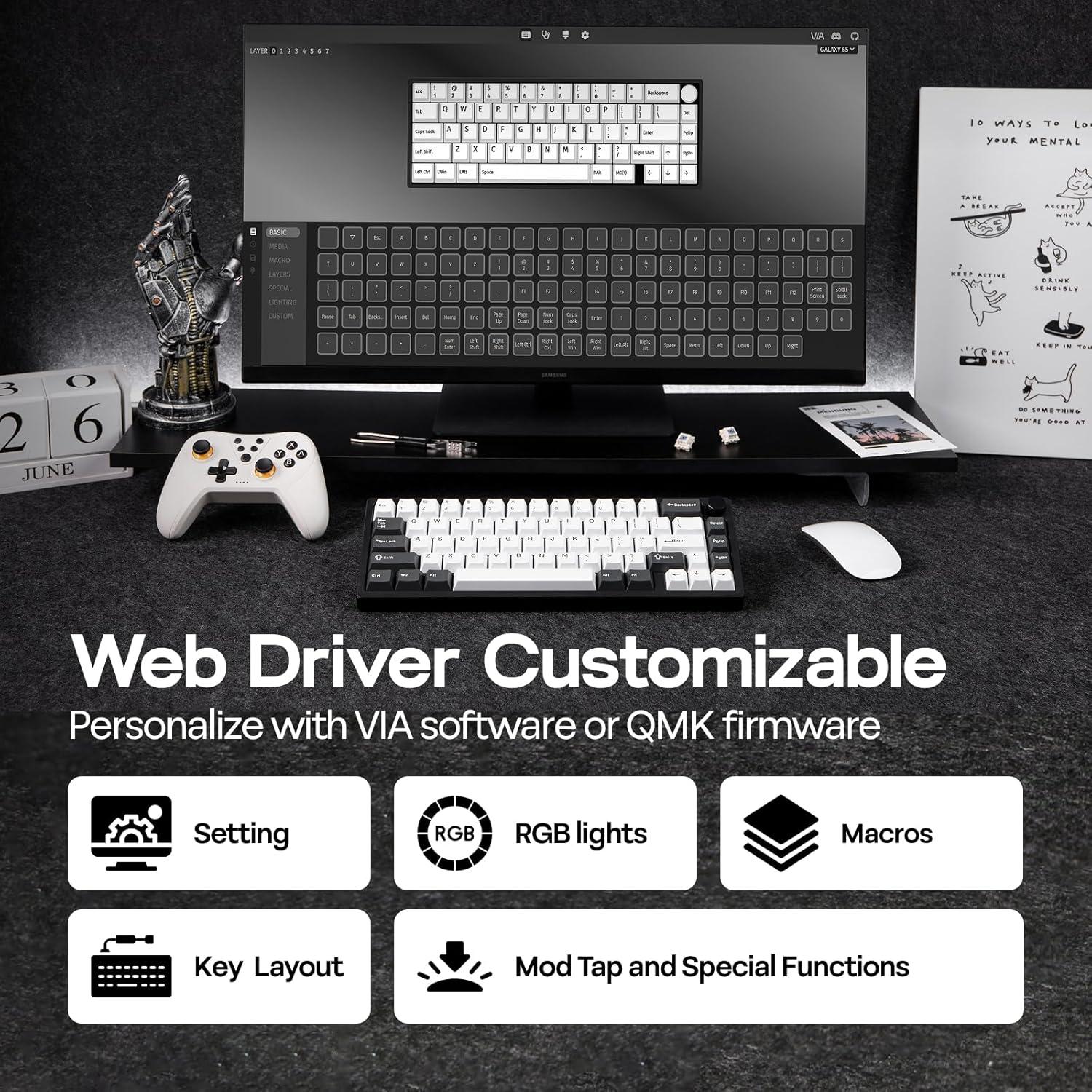 QMK/VIA Custom Keyboard: Level up your game with the Galaxy65 QMK Keyboard – the ultimate custom keyboard with unbeatable control. With QMK firmware and VIA software, Galaxy65 keyboard offers limitless customization, where complex commands can be executed with a single keystroke thanks to recorded macros and layouts can be personalized with remapping for maximum efficiency and accessibility. From key’s function to typing feel, fine-tune every aspect of this QMK keyboard with hot-swappable PCB that support both plate-mount and screw-in stabilizers. Elevate your setup, enhance your gameplay, and unleash your full potential with our Galaxy65
