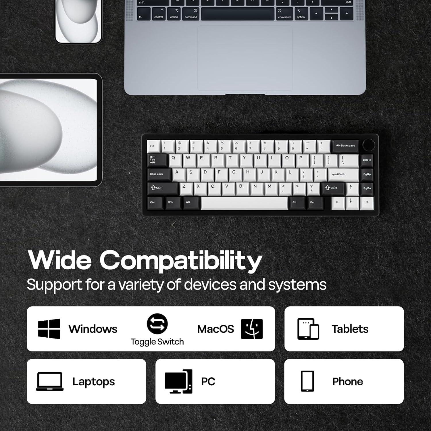 200-Hour Long-Lasting Wireless Performance: Upgraded in circuit design and battery quality, the Galaxy65 keyboard presents reliable and long-lasting wireless performance, offering an impressive 200 hours of use with backlight off on a single charge with a 4000mAh rechargeable battery. Packed with three modes of connection and an easily accessible mode switch besides the USB port, the Galaxy65 keyboard offers reliable 2.4Ghz wireless, low-latency cable mode and the versatile Bluetooth connectivity. Indulge yourself in continuous gaming sessions with no hassle of cable nor interruptions from charging, and relish in the enduring and stable performance made possible by Galaxy65 keyboard