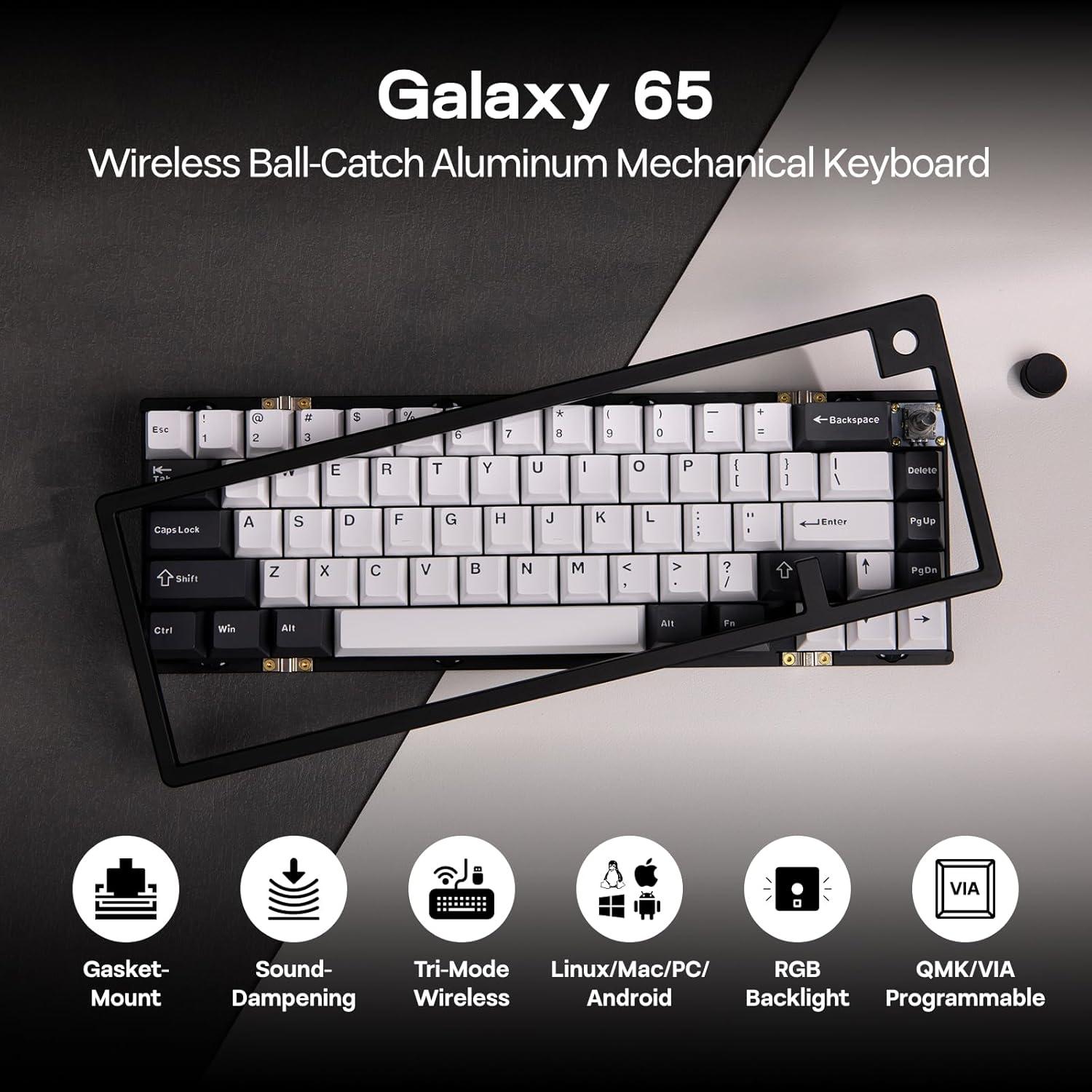 65% QMK Aluminum Keyboard with Enhanced Typing Sound: Following the EPOMAKER Galaxy70, Galaxy80 and Galaxy100, we are proud to present the innovative new member of the Galaxy Aluminum Keyboard series, with smaller size and greater functions. Introducing Galaxy65, the 65% compact layout wireless keyboard with ball-catch Gasket-Mount and QMK support. Featuring a gasket-mounted structure, high-quality lubed linear switches, and 5 soft cushioning layers, a market-tested formula for satisfying creamy typing sound, the Galaxy65 Keyboard aims at maximum comfort and customization with wide compatibility across PC, Linux computer, Mac Laptop, Android mobiles, and mainstream gaming controllers