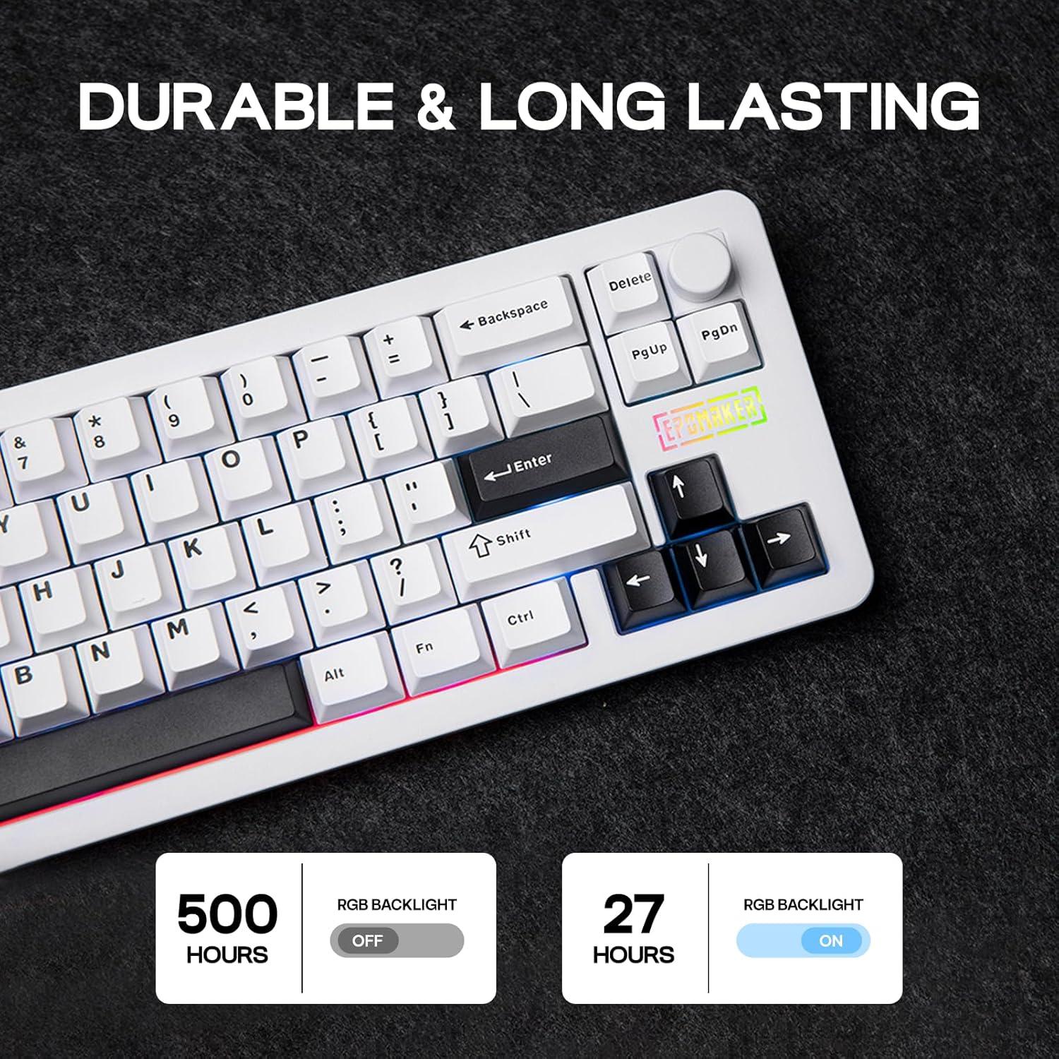Wireless Gaming Keyboard with 6000mAh Power: Power your passion with the double 3000mah battery of Galaxy68 wireless keyboard, delivering an astounding 500 hours of light-off usage for weeks in Bluetooth or 2.4Ghz on a single charge, or 27 hours of continuous wireless command in marathon gaming sessions with vibrant backlighting at brightest. Revel in the stable 1000Hz polling rate in both 2.4GHz wireless and wired modes for instant trigger and experience a virtually instantaneous connection between your actions and in-game results with the ultra-low 2.5ms latency in cable mode.