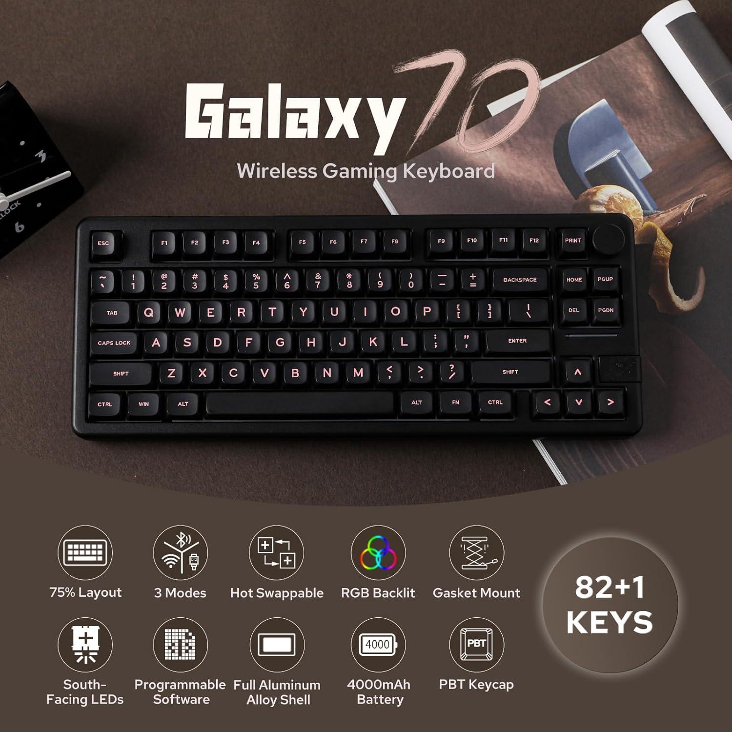 【Tri-Mode Connectivity & Long-Lasting 4000mAh Battery】The Galaxy70 wireless keyboard is engineered for versatility, offering Bluetooth, 2.4GHz wireless, and wired USB options to suit every setup. Whether you're aiming for a sleek, wireless workspace or the reliability of a wired connection, this keyboard seamlessly meets your demands. Boosting your productivity and gaming, its 4000mAh battery ensures prolonged performance. With such substantial battery life, the Galaxy70 supports extended work sessions and gaming marathons that keep pace with your dynamic lifestyle.
