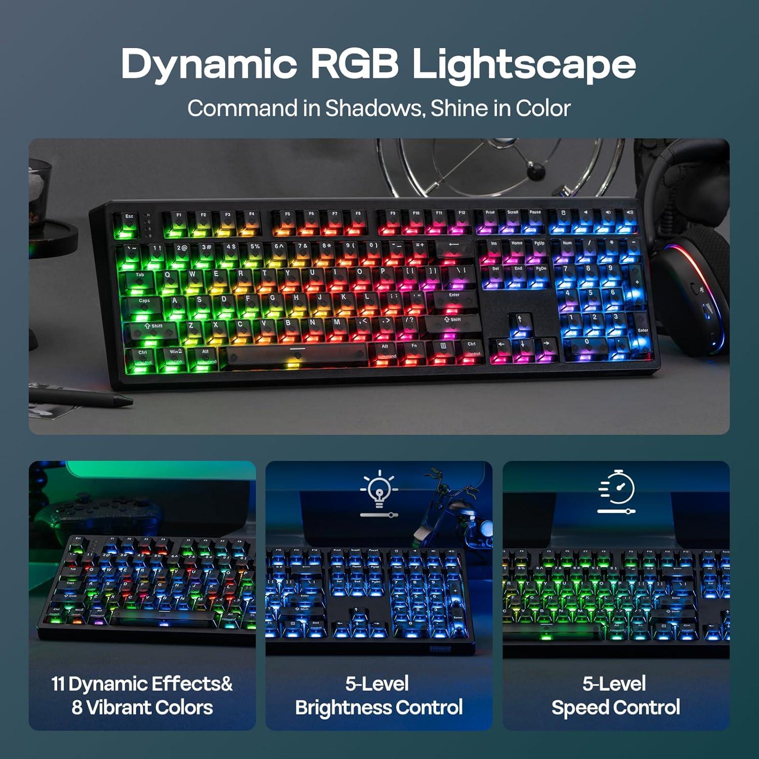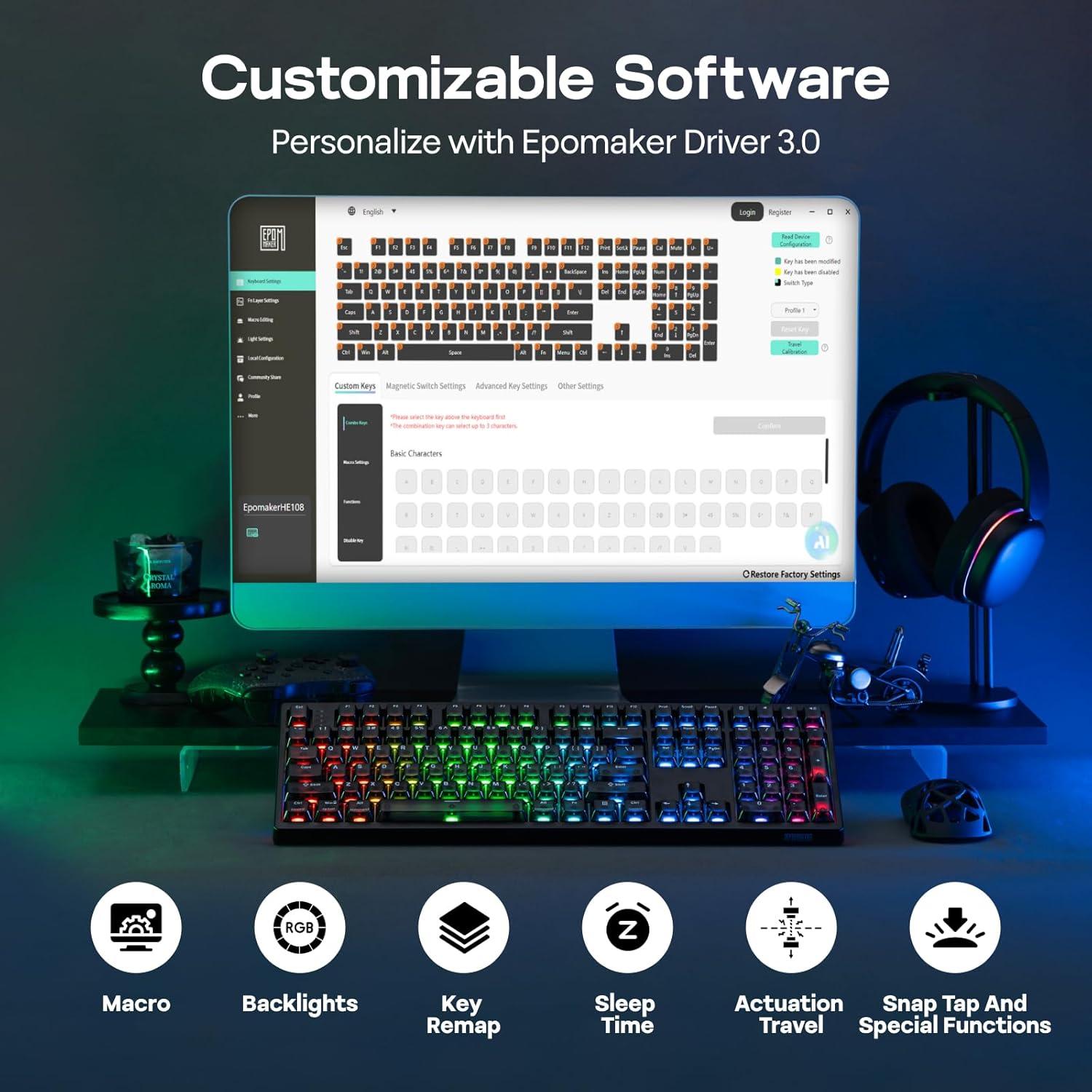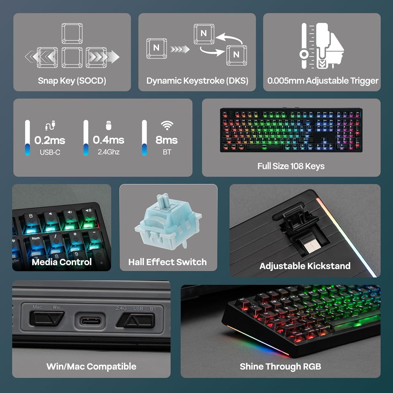 0.005mm Adjustable Actuation: Game in your full potential with the responsive HE108 wireless gaming keyboard. Adjust dead zone from 0 to 0.3mm with the WIN/Mac compatible software, for near-instantaneous actuation in clutch gaming moments or flawless coding in writing marathons. With per 0.005mm adjustable actuation in rapid triggering mode, customize exactly how deep or shallow to press the key for registration or end of input, and switch easily between typo-free 3.3mm to near-instant 0.1mm.