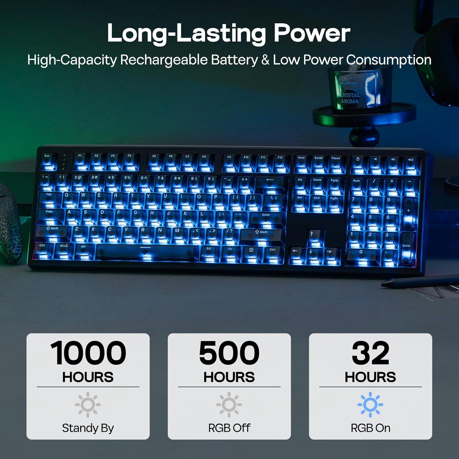 2.4Ghz/BT/Wired Gaming with 10000mAh Battery: Unlocking the realm of unfettered movement and sustained performance with this tri-mode wireless keyboard, for up to 500-hour (RGB Off) wire-free usage with the outstanding 10000mAh battery. Experience seamless transition between up to 5 paired devices under cable, 2.4Ghz and BT modes, with the on-board memory of HE108 custom keyboard that remember your personalized setting for every hall effect magnetic key.