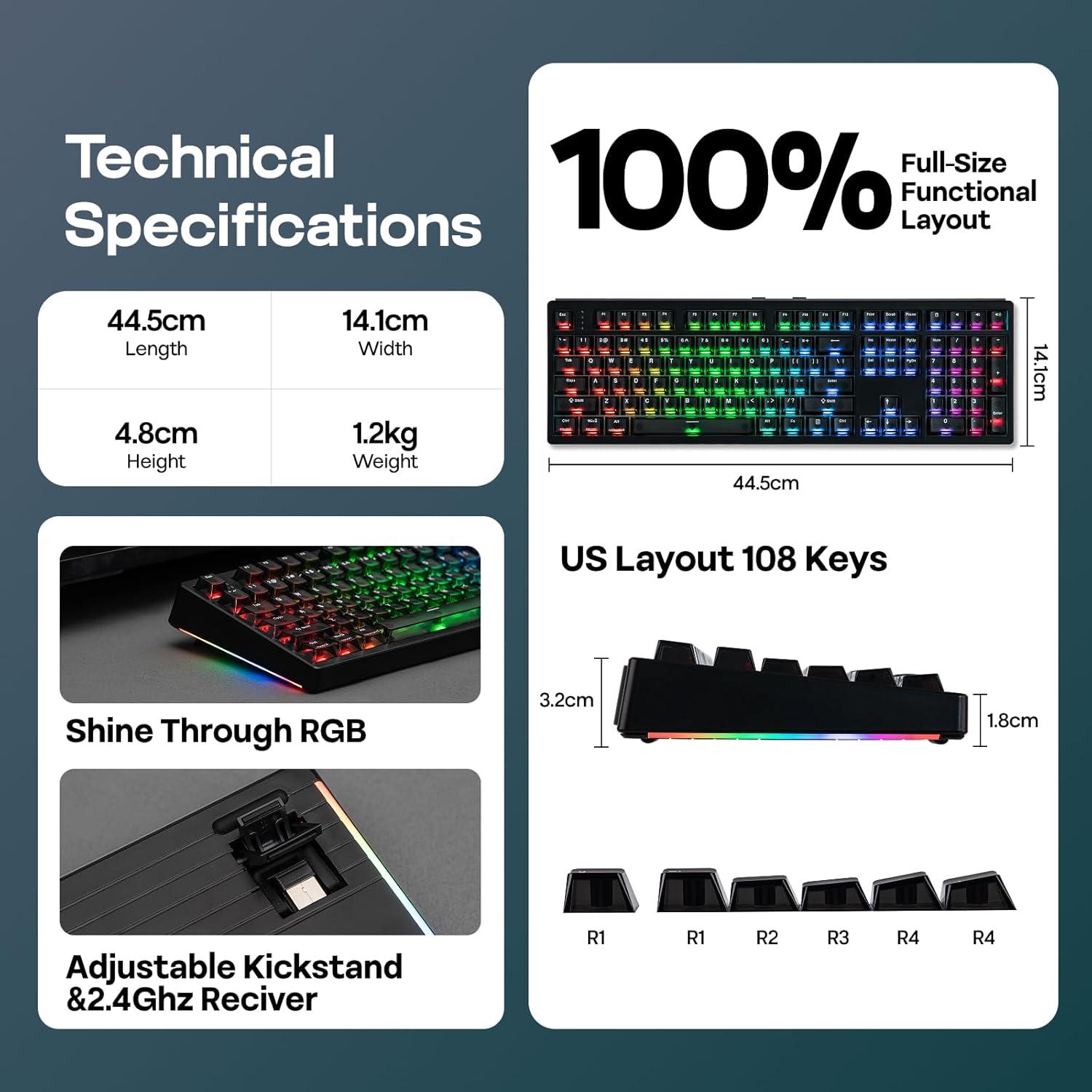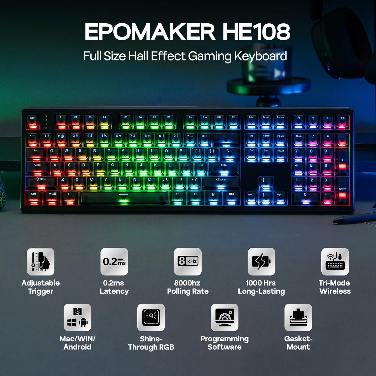 108-Key Full-Sized for Mac/WIN: Engineered for competitive gaming and demanding office tasks, the EPOMAKER HE108 is packed with user-friendly design. Featuring 108 shine-through double-shot PBT keycaps for truly backlit RGB with clear visibility under light and at dark, the HE108 full-sized gaming keyboard weighs over 1.2kg for un-moving stability and durability. For hybrid users across Mac/iOS and PC, the WIN/Mac compatible software and the mac sign included keycaps makes multi-device usage swift and easy.