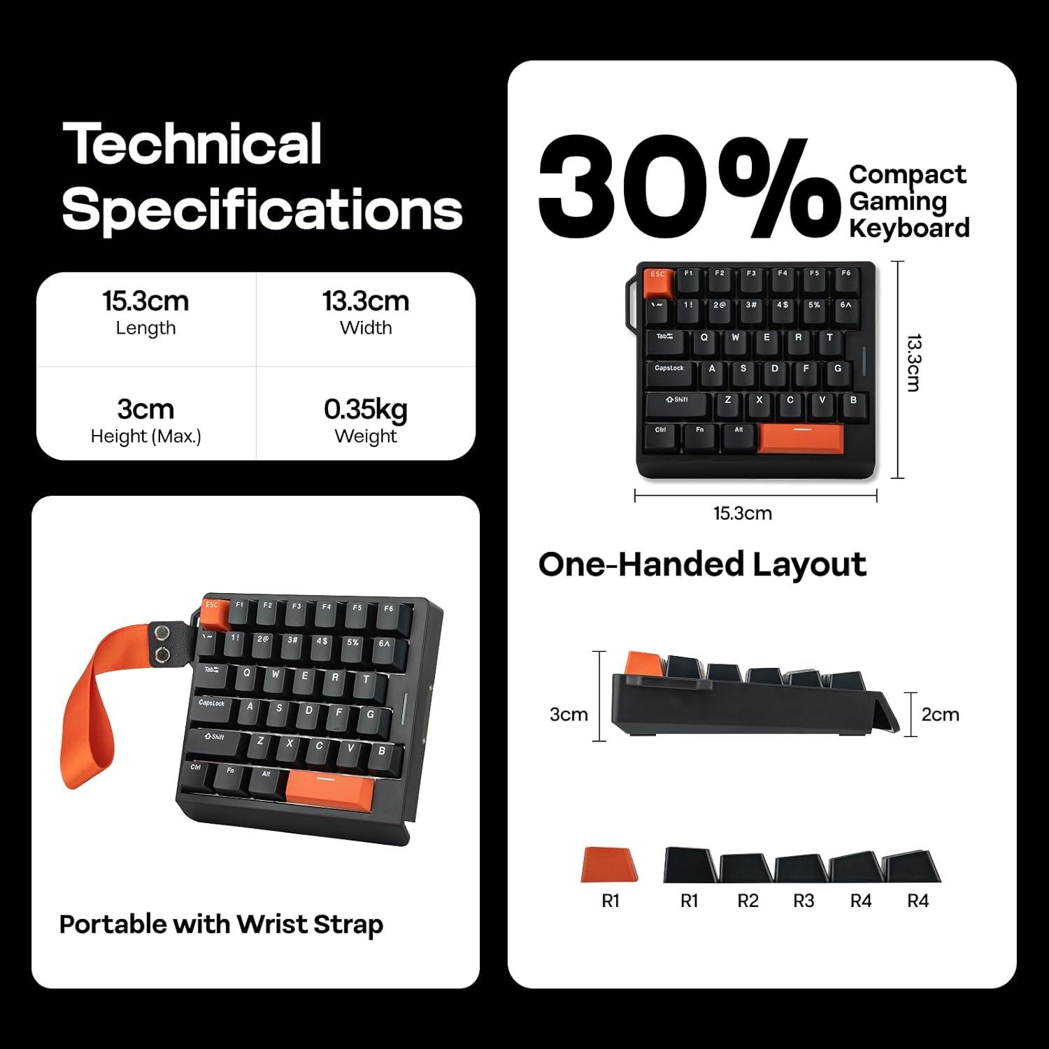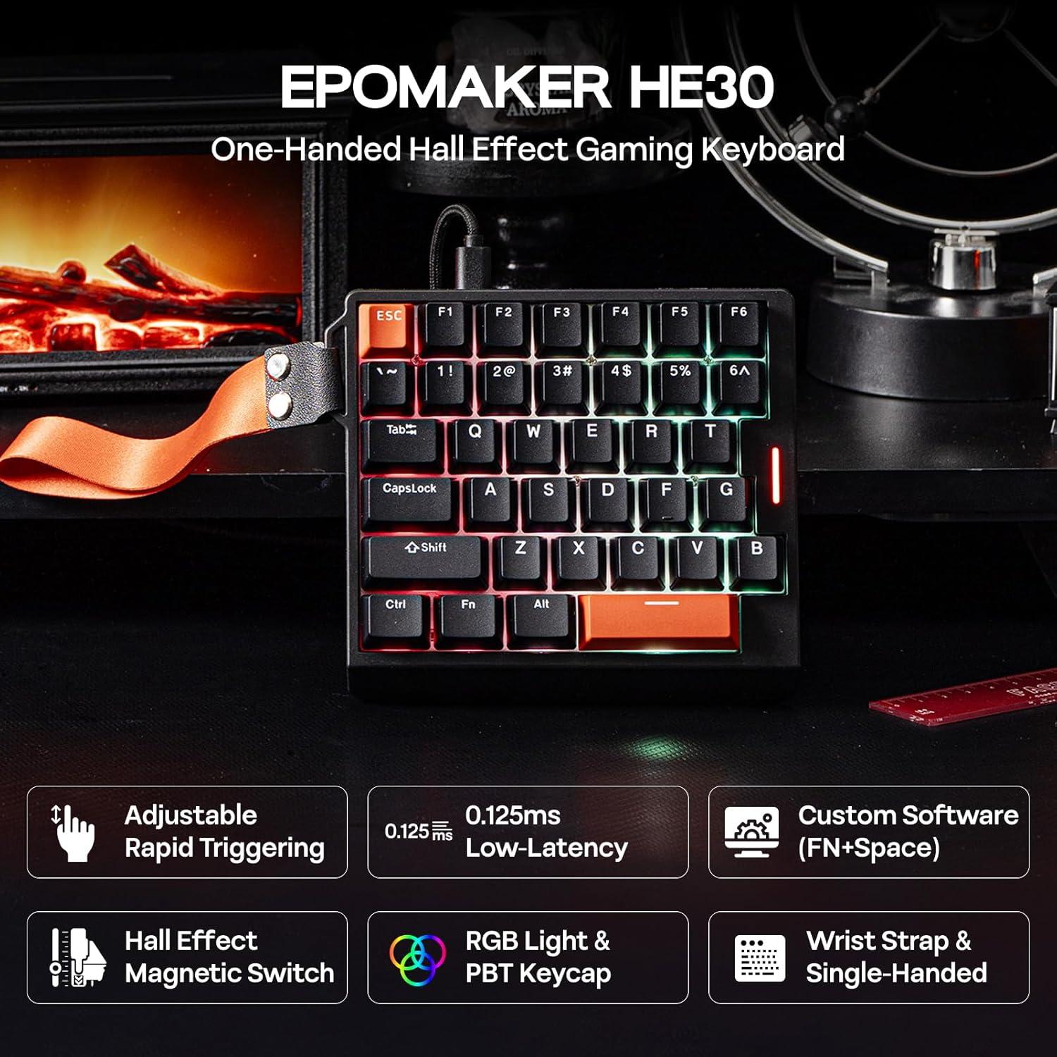One-Handed Gaming Keyboard: Meet EPOMAKER HE30, the ultimate one-handed Hall Effect keyboard featuring left-hand layout. The 36 programmable keys, which allow macros binding or modifiers reassigning via web-based software, come with premium PBT keycaps that resist the “greasy” shine and fading. With adjustable trigger, set your movement keys to 0.1mm instantaneous trigger or configure your “Ultimate” to 3.4mm to eliminate accidental activation. Whether you’re dominating tactical shooters or enjoying a leisure building game, the HE30 keyboard delivers the customizability and durability you need.