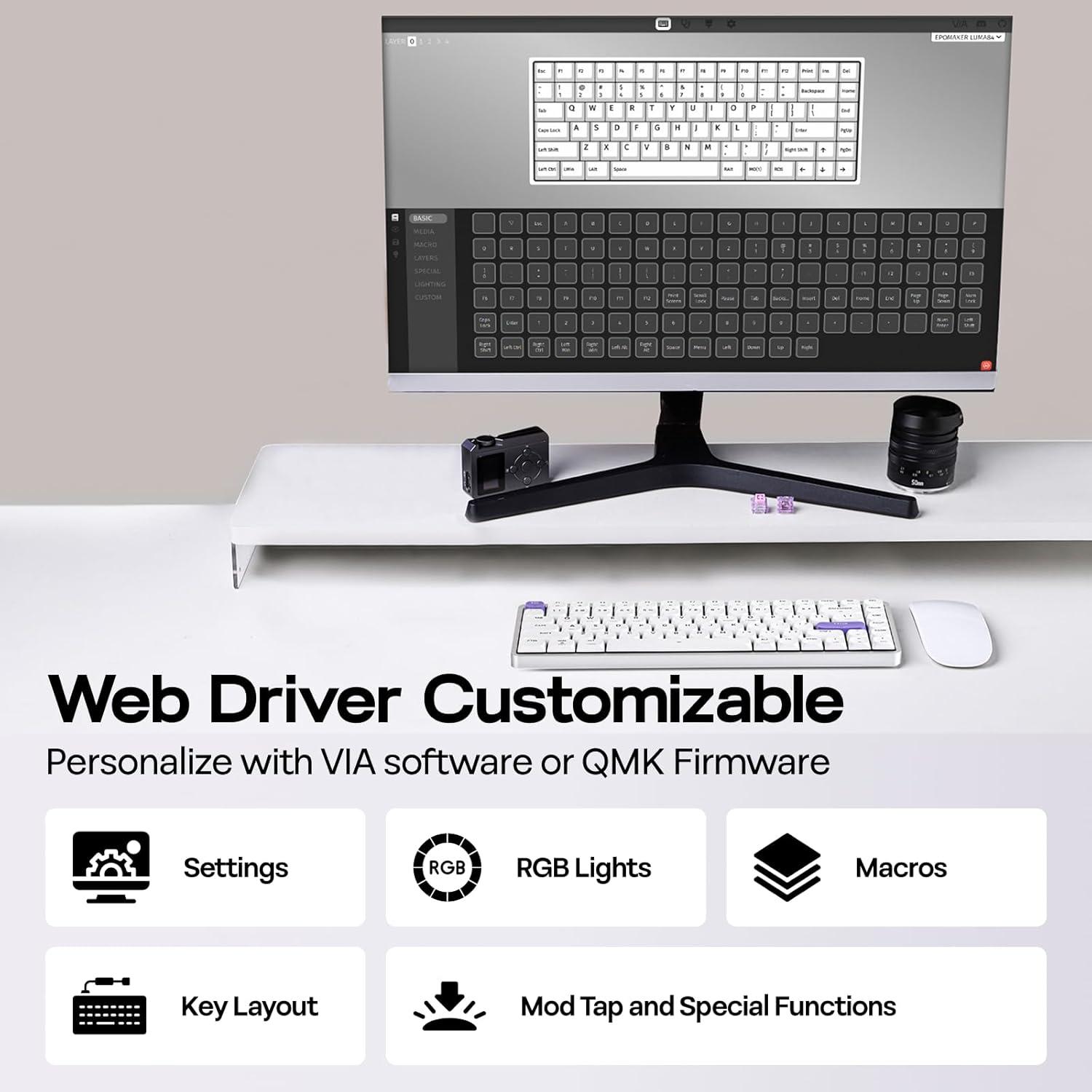 User-Friendly Control: Designed for easy and intuitive use, the Luma84 Aluminum Keyboard is packed with user-centered details. Not just visually appealing and durable, the DSA profile keycaps adopt dye sublimation and double-shot processing to present you with clear letters and instruction signs such as Mac modifiers in lighter colors. Experience stunning visuals with dynamic RGB backlighting, easily customizable in color and effects via hotkeys and the webpage VIA software, saving you the trouble of downloading across all operating systems and devices