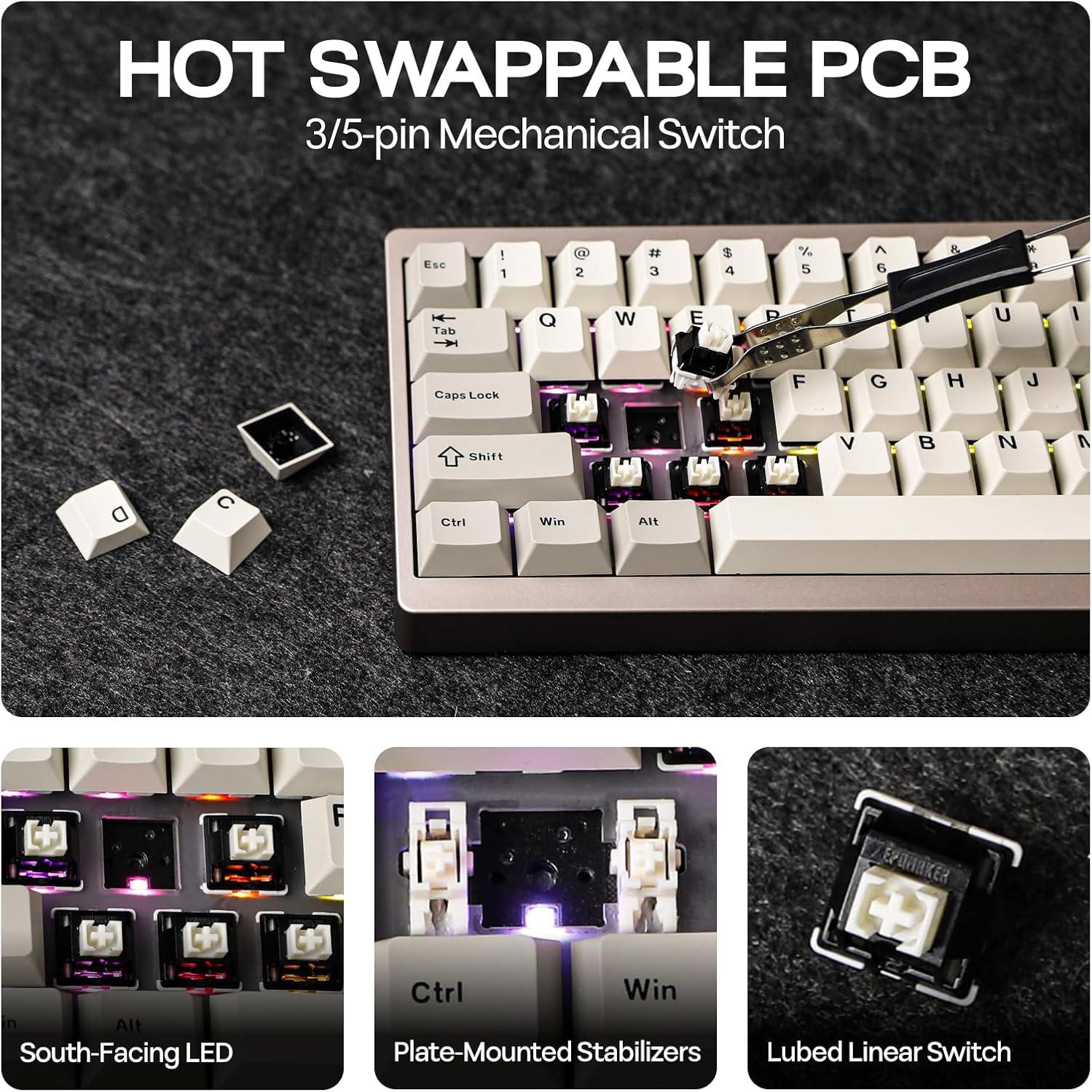 Durable Aluminum Build Quality: Constructed from durable aluminum with an anodized finish, this keyboard is designed to endure daily use while resisting wear and corrosion, ensuring long-lasting performance in any environment. It offers superior resistance to bending, flexing, and scratches compared to plastic. Featuring a hot-swappable PCB with precisely tuned plate-mounted stabilizers and support for screw-in stabilizers, it allows for easy switch replacement without soldering. This enables you to choose your preferred switches for a customized typing experience, whether you prefer tactile, linear, or clicky feedback