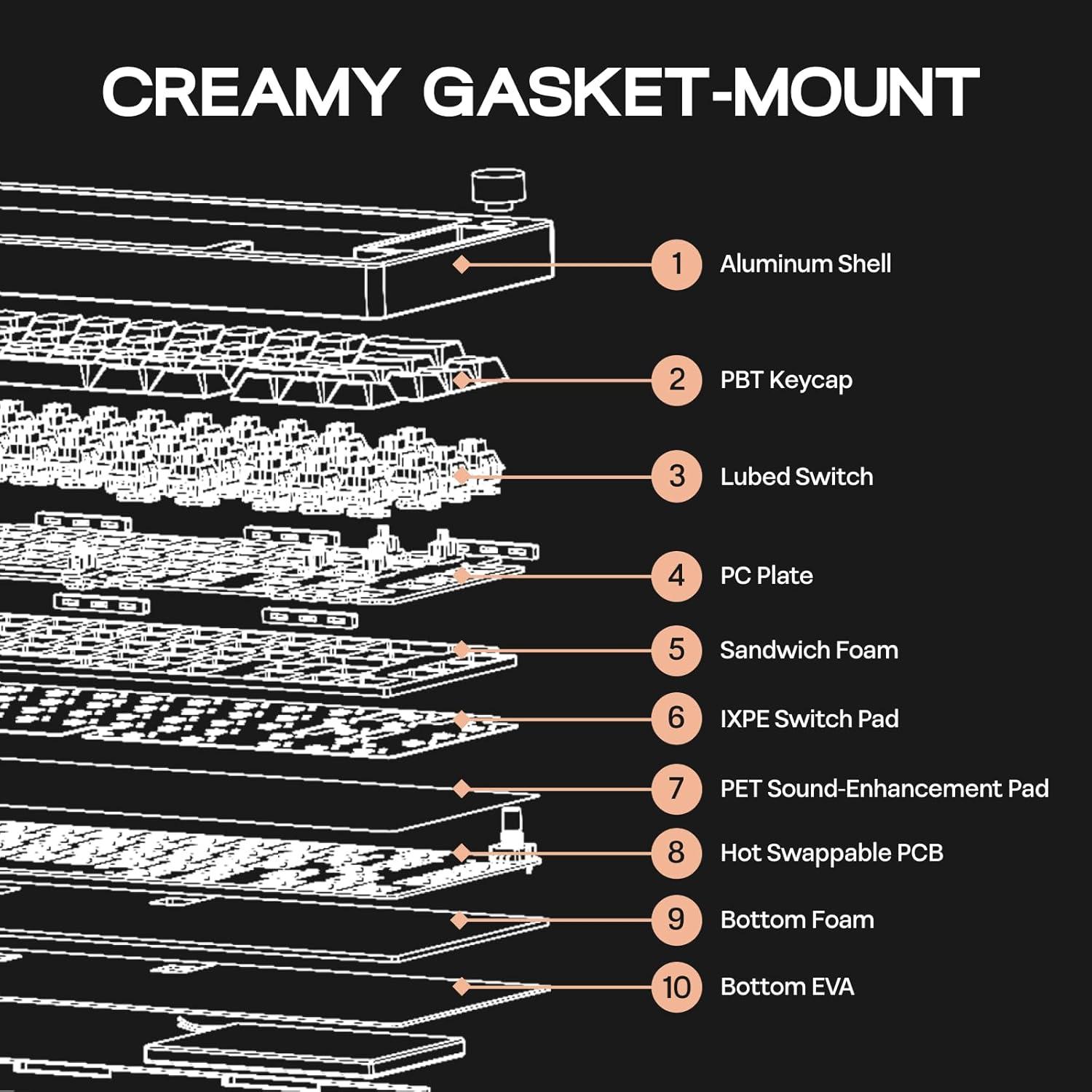 Enhanced Typing Sound&Vibrant RGB Backlighting: Experience quieter keystrokes with advanced sound-dampening materials, including sandwich foam, IXPE switch pad, PET sound pad, sound-absorbing foam, and EVA case foam. This thoughtful design significantly reduces noise while enhancing the overall sound profile of the keyboard. Additionally, the south-facing RGB backlighting creates a visually stunning setup in both low light and bright conditions. The per-key RGB backlighting improves visibility in dim environments and allows for customization