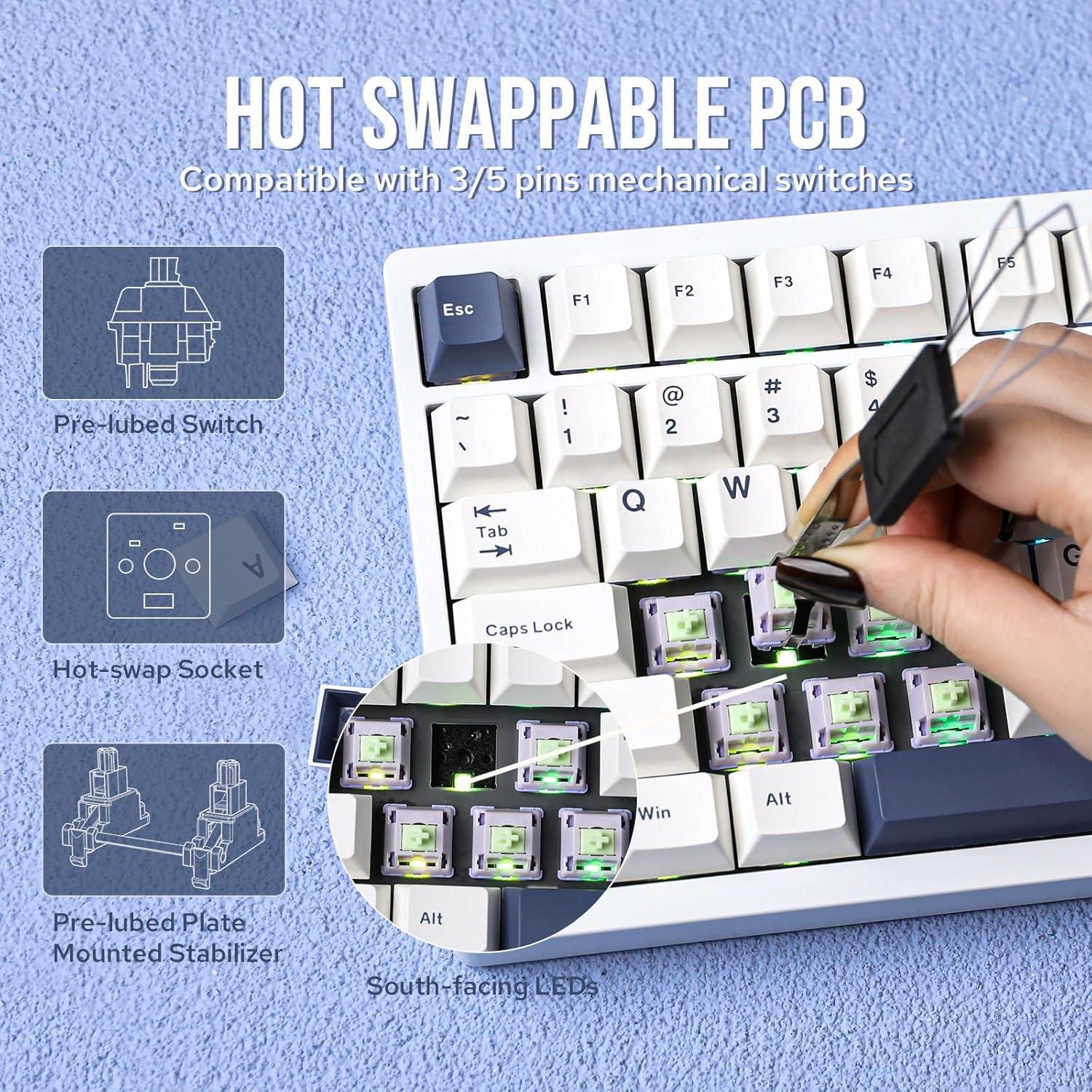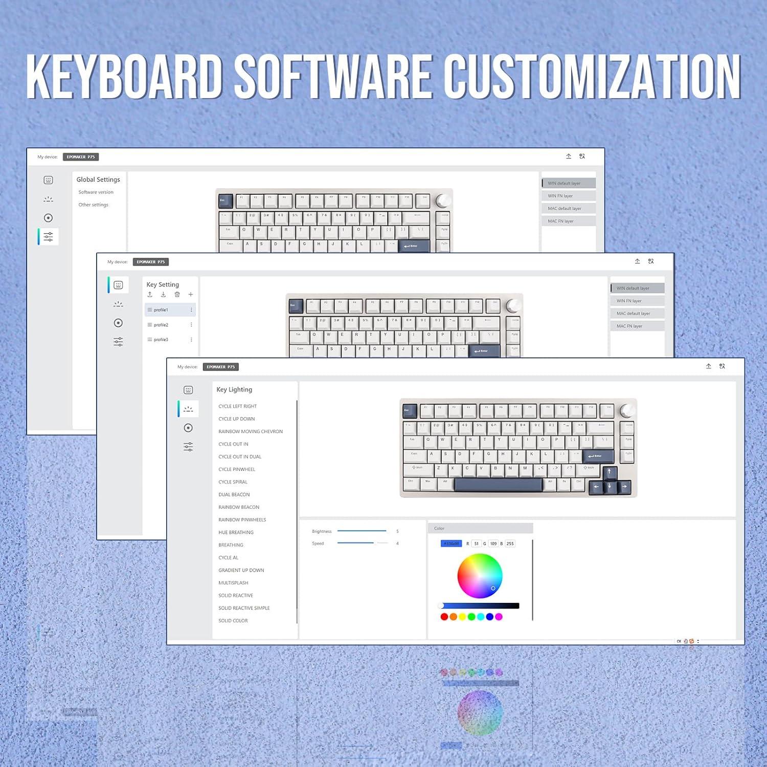 【Hot Swappable PCB with Screw-in Stabilizer Support & South-Facing RGB】The P75 custom mechanical keyboard comes with a hot-swappable PCB, allowing easy switch changes without soldering. The default plate-mount stabilizers are finely tuned for an excellent out-of-the-box experience. For those who prefer screw-in stabilizers, the P75’s PCB supports this option, catering to customization enthusiasts. The south-facing RGB backlighting shines through from the south side (near the typist) of the switch, making it easier to see the RGB backlight with non-shine-through keycaps
