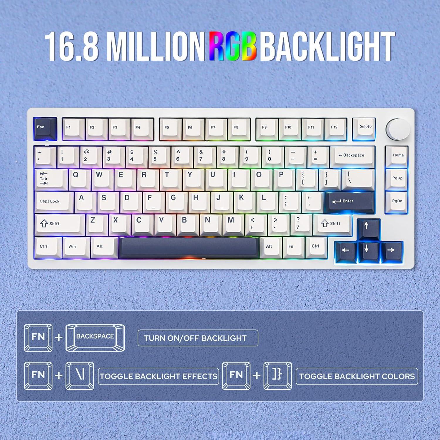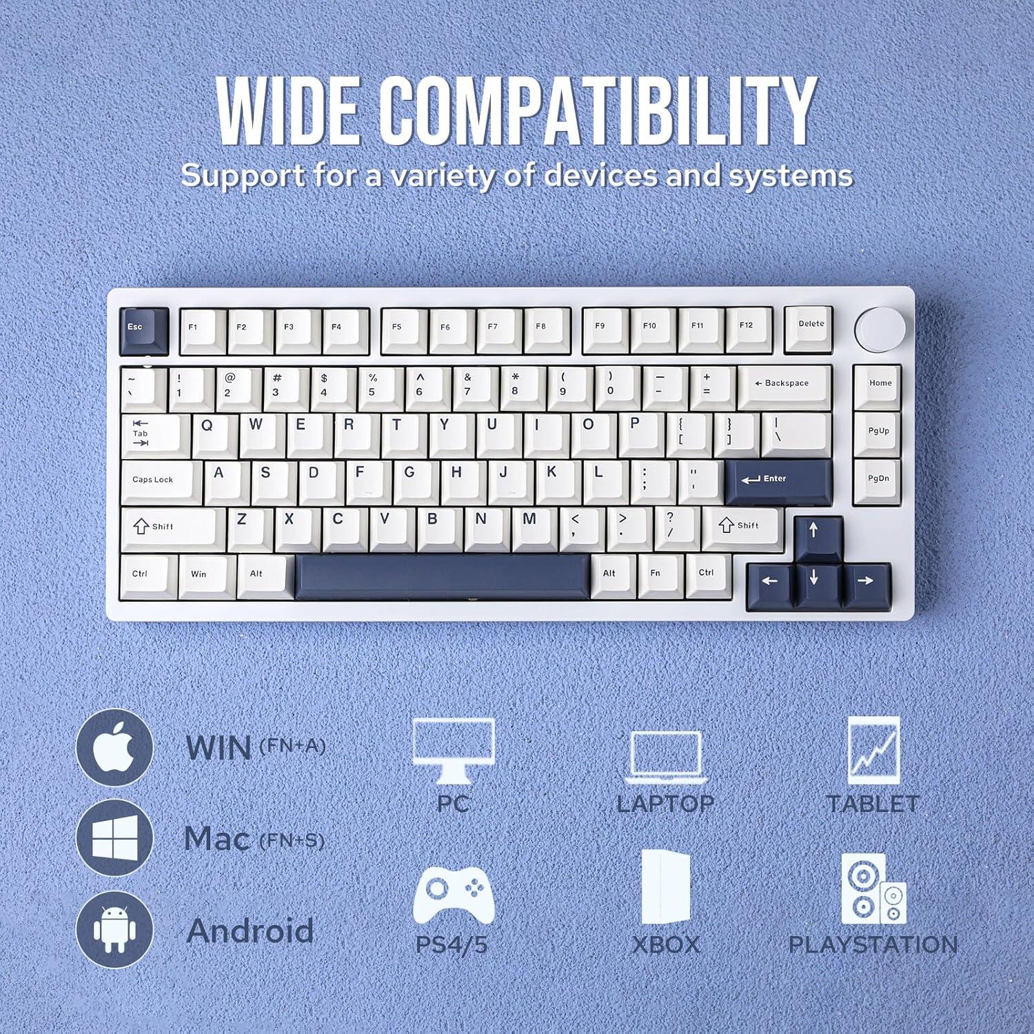 【75% Compact Layout with Metal Knob】The 75% layout streamlines function keys while retaining commonly used directional and F keys, providing an easy transition for new users compared to smaller layouts. A metal knob in the top right corner allows for effortless media control. With a front height of 22.7mm (silicone feet included) and a 6-degree typing angle, it’s designed for comfort during long typing sessions