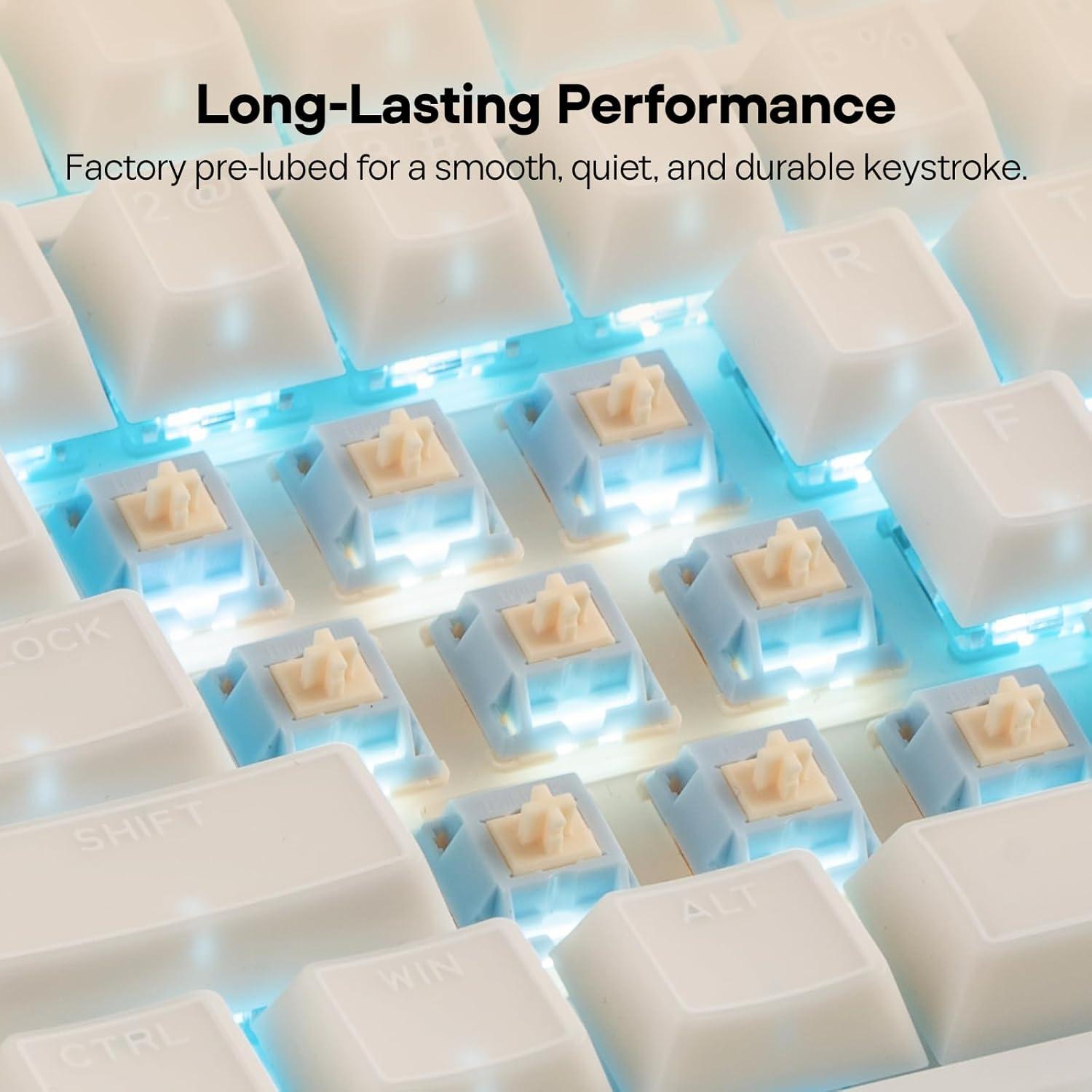 Pre-Lubrication for Effortless, Long-Lasting Performance: Every switch in this set comes factory pre-lubricated, delivering a consistently smooth, seamless feel with every actuation. Paired with its PC housing and POM stem, this pre-lubed design not only ensures crisp, stable key presses but also minimizes noise to an exceptional degree. Beyond immediate comfort, the pre-lubrication actively reduces friction between internal components, slowing down wear over time to extend the switches’ lifespan. It also preserves a satisfying tactile response, striking the perfect balance between effortless operation and the responsive feedback users expect from high-quality mechanical switches.