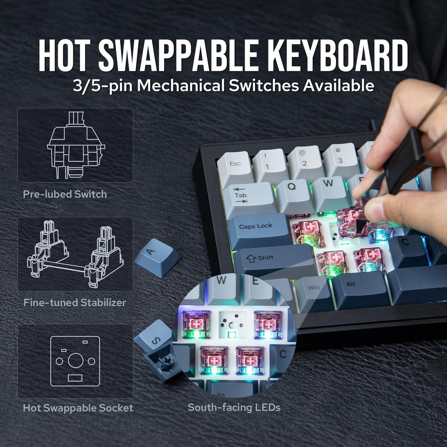 South-Facing RGB Backlight & Hot-Swappable PCB: For aesthetics and functionality, the Split65 keyboard houses per-key LEDs in south-facing style. The RGB backlight provides consistent vibrant atmosphere light in 16.8 million colors and dozens of pre-set light effects. Customize the keyboard’s appearance with the adjustable RGB in brightness, color and speed, or experiment with the typing feel with hot-swappable PCB that’s compatible with mainstream 3/5-pin mechanical switches. Experience the Split65 keyboard, which is not merely a tool with top-notch function, but a source of fun and creativity with unique design and powerful customization options