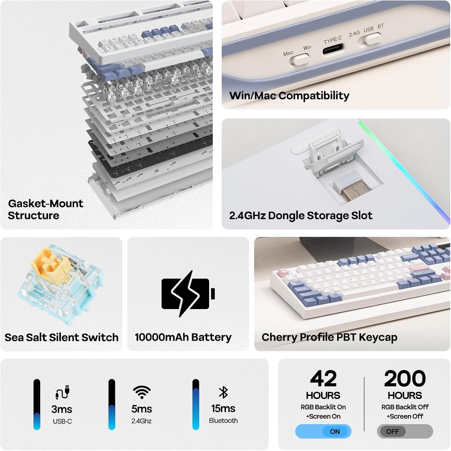EPOMAKER TH108 PRO Full Size Mechanical Keyboard with Screen & Knob, Wireless Gaming Keyboard with 10000mAh, Creamy Gasket, Hot Swap, Custom Driver, RGB Backlight (White, Sea Salt Silent)(White)