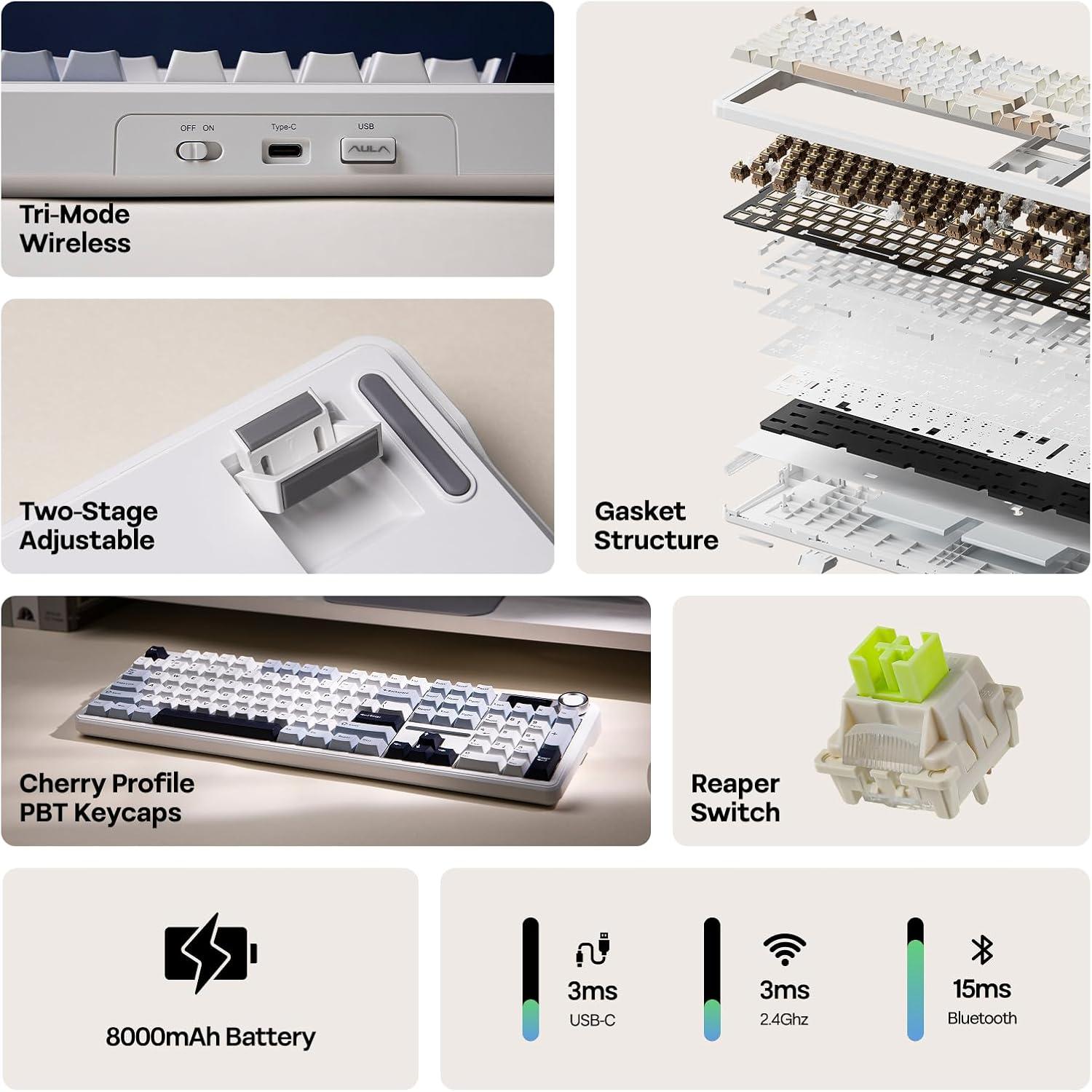 100% in Size, Performance and Comfort: Meet the 100% full size variation of the EPOMAKER X AULA F75 Max, the F108 PRO Mechanical keyboard that offers the same creamy sound and unparalleled performance as F75 Max but in upgraded full-size layout with customizable Screen. The 104 anti-ghosting keys deliver accuracy and greater possibilities in configuration and controlling, ideal for multitasking and fast response in gaming and office. While the 2-stage kickstand, low front height and cherry profile keycaps rid you of finger fatigue and wrist strain for a pain-free day of work