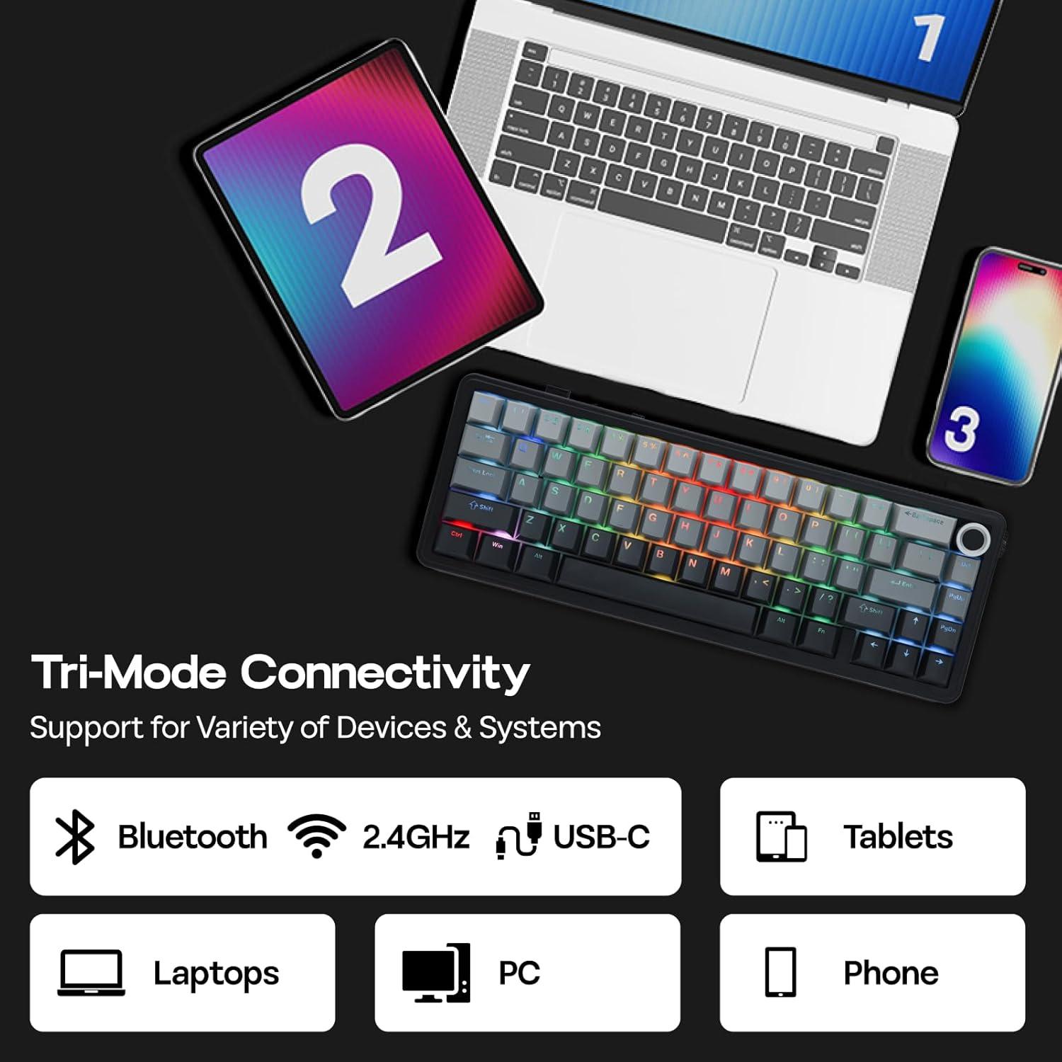 WIRELESS CONNECTION, LIMITLESS CONTROL: Unlock the pinnacle of keyboard versatility and seamless control with our F65 PRO as true game-changer for streamlined workspace and desk top setup. Embrace the freedom of wireless connectivity, effortlessly switching between Bluetooth, 2.4GHz wireless, and wired modes to suit any setup or device, whether it's for your desktop, mac laptop, android tablet, or phone; and elevate your workflow with the intuitive knob control, enabling rapid adjustments to volume and backlight on the fly without complicate key string or drop down menu to keep you focused on the action.