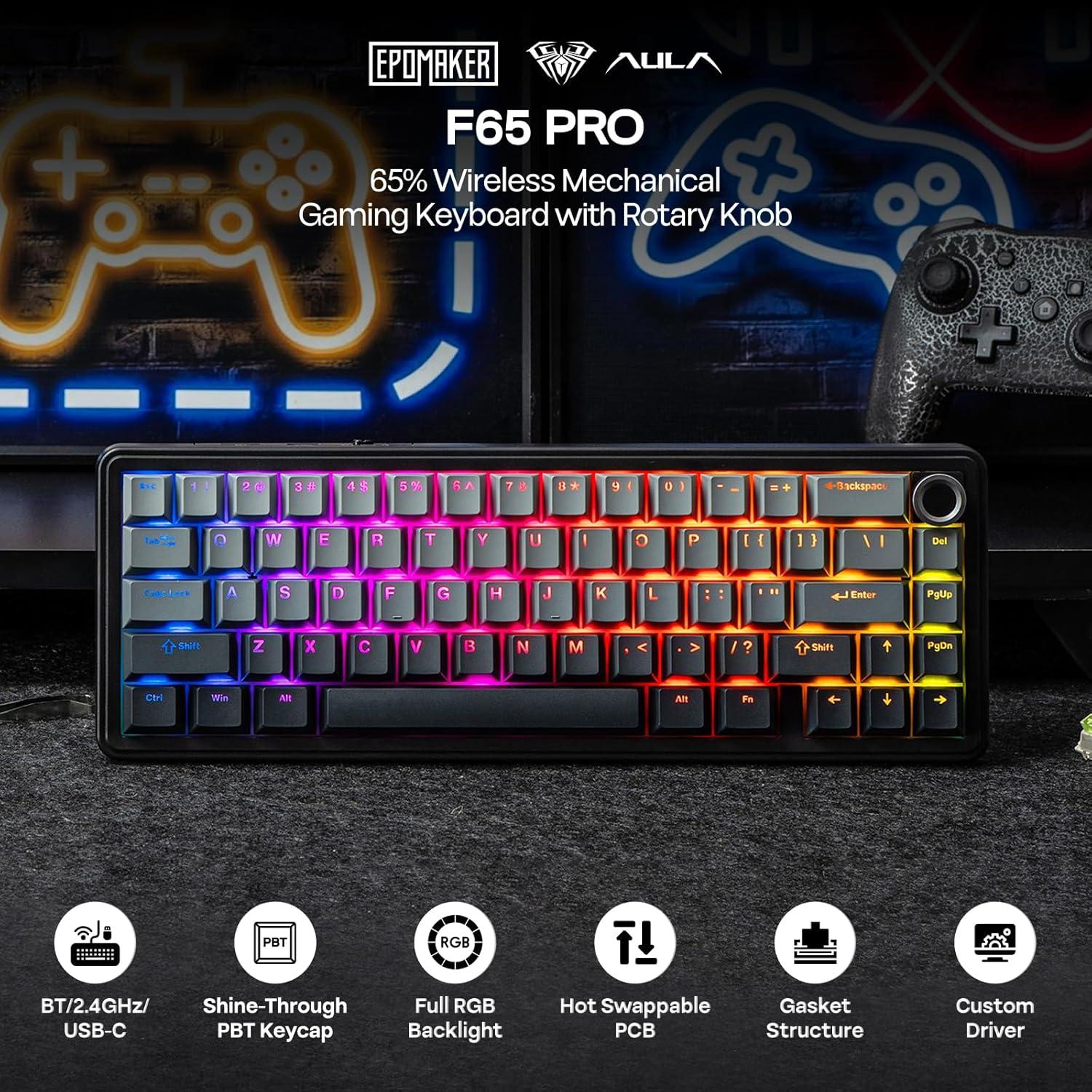 EPOMAKER X AULA F65 PRO: Draw from the predecessor Aula F65 with creamy sound and compact size, the F65 PRO features a rotary knob and the innovative top-printed shine-through keycaps with topographic lines. Designed for those who demand peak performance and personalized perfection in compact, travel-ready size, the F65 PRO features hot-swappable pre-lubed switches, sound-dampened Gasket structure, programmable keys and RGB, and a 4000mah battery for versatile setup. Revel in the premium sound and responsive feel of this 0.8kg portable peripheral, as this customizable command center light up your desk with precision and brilliance.