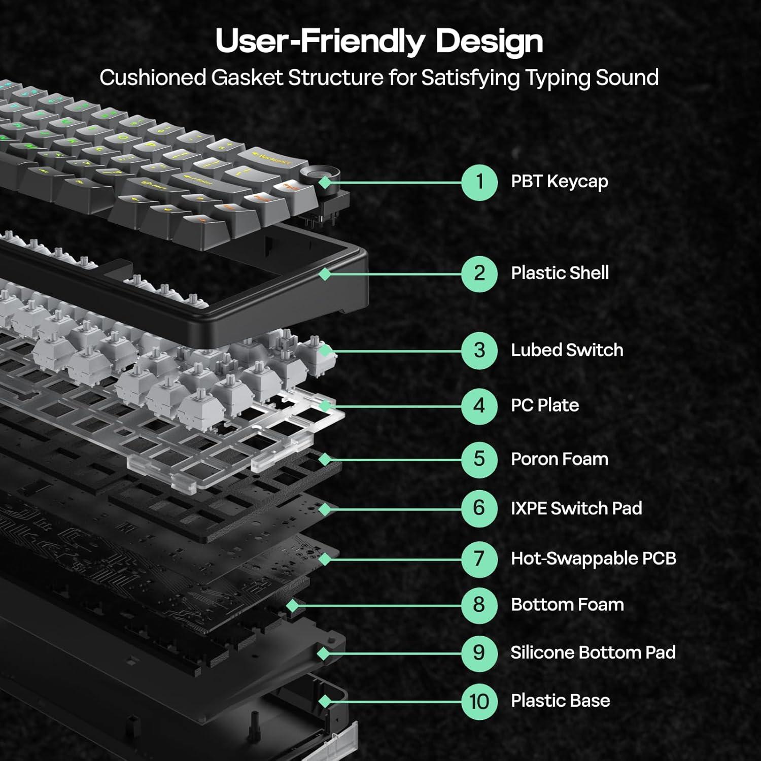 CREAMY GASKET-MOUNT: Experience the unwavering stability of finely tuned plate-mount stabilizers, for consistent and wobble-free keypress, maximizing accuracy and reliability in the heat of battle. Feel the buttery-smooth actuation of expertly lubed switches, delivering a tactile experience that's both responsive and luxurious, enhancing your comfort during extended gaming sessions. Try the satisfyingly muted thud of each keystroke, achieved through the innovative Gasket-Mount design and a meticulously crafted 5-Layer sound-dampening system, eliminating unwanted resonance and creating a truly immersive soundscape.