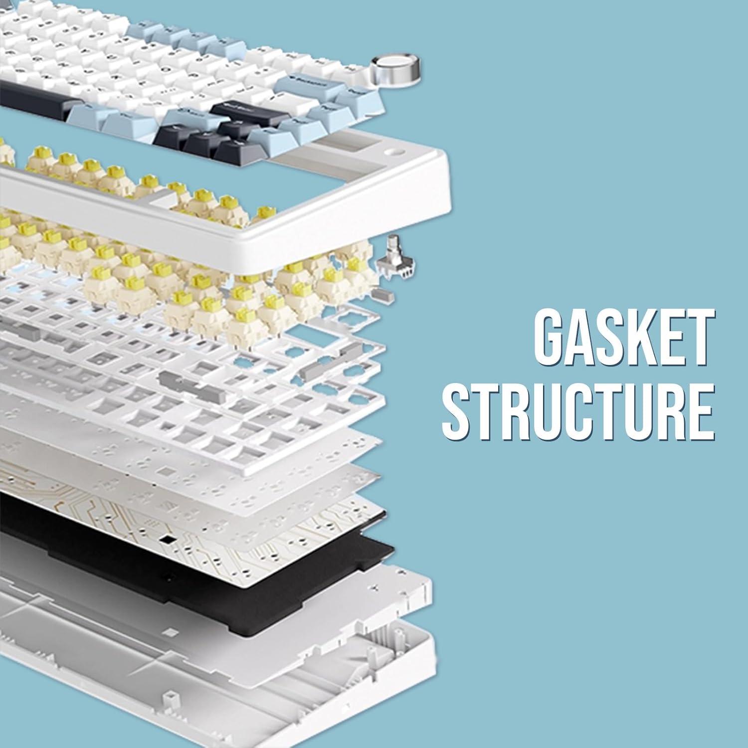 【Optimized 75% Compact Layout&Innovative Gasket Structure】The F75 redefines space efficiency with its 75% compact layout. This design integrates all the essential keys in a smaller footprint, making it perfect for streamlined desks and mobile setups without sacrificing functionality. Experience the pinnacle of comfort with the gasket structure. This advanced design ensures a flexible yet firm typing experience, reducing fatigue during prolonged use while maintaining a consistent and responsive key feel.