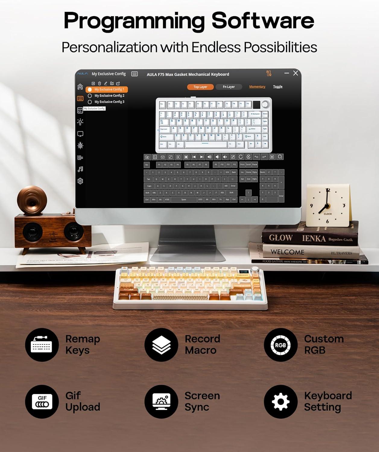 Custom Keyboard with Compatibility: As personalization being our core branding, our F75 Max isn’t shy in the realm of customization. With south-facing per-key LEDs and light diffusers on the Reaper switches, the RGB Backlight shines brightly with pre-set dynamic effect, adjustable in color and style via software, screen and shortcut. The hot-swappable F75 MAX comes with plate-mount stabilizers but is compatible with 3/5-pin mechanical switches and screw-in stabilizers for experimenting typing feel and sound, while the software offers key remapping and macro editing for efficiency and accessibility