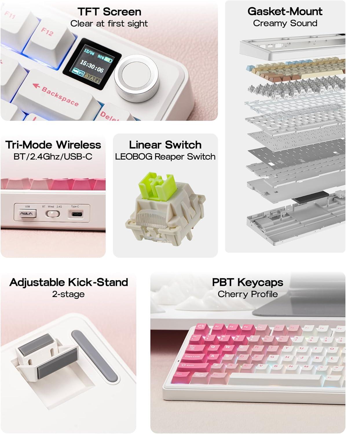 EPOMAKER X Aula F75 MAX Wireless Mechanical Keyboard with TFT Screen and Knob, Gasket Keyboard in 75% Layout, Hot Swappable Gaming Keyboard for PC/Mac/Linux (White Pink)(White Pink)