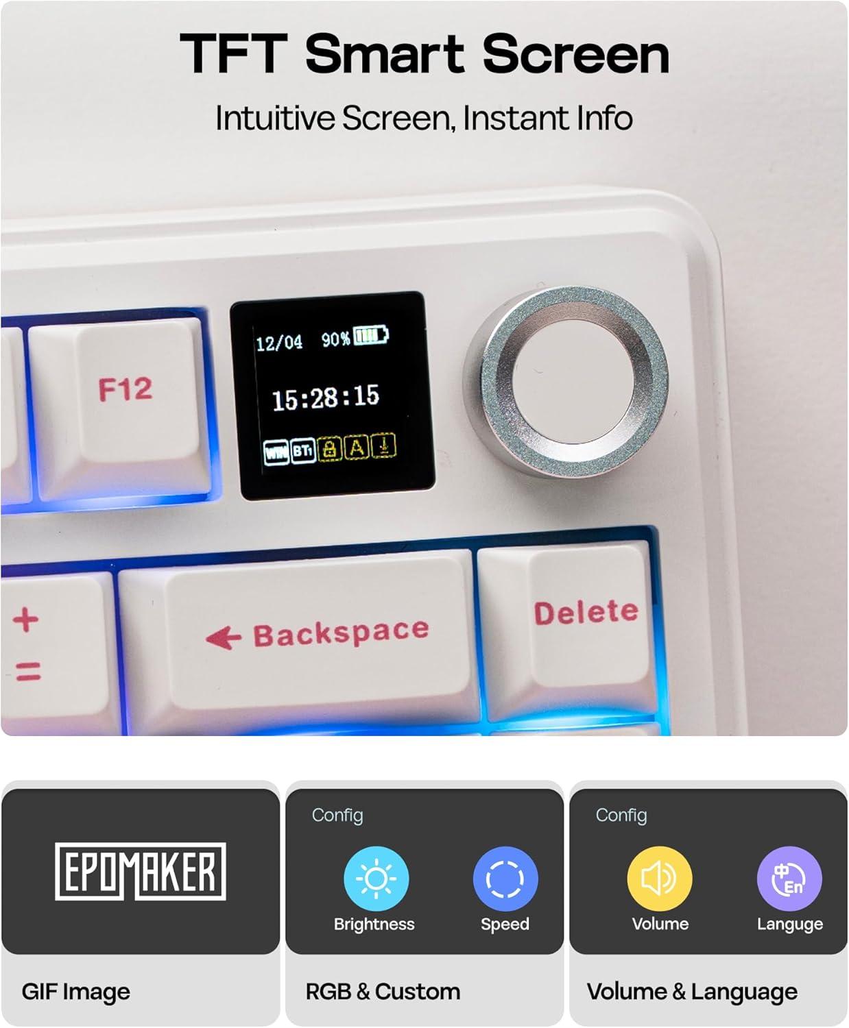 Compact Size, Function Core: With 80 programmable keys and a customizable screen, the F75 Max upgrades from its successful predecessor EPOMAKER X Aula F75 with equal reliability and incredible new functions. Revel in the convenience the volume knob offers and enjoy the Gif-showing screen that makes Backlight customization fun and easy. With connectivity, battery monitor and indicator lights combined in one, the F75 Max keyboard with TFT smart display will be your inseparable helper and productivity booster in gaming and life