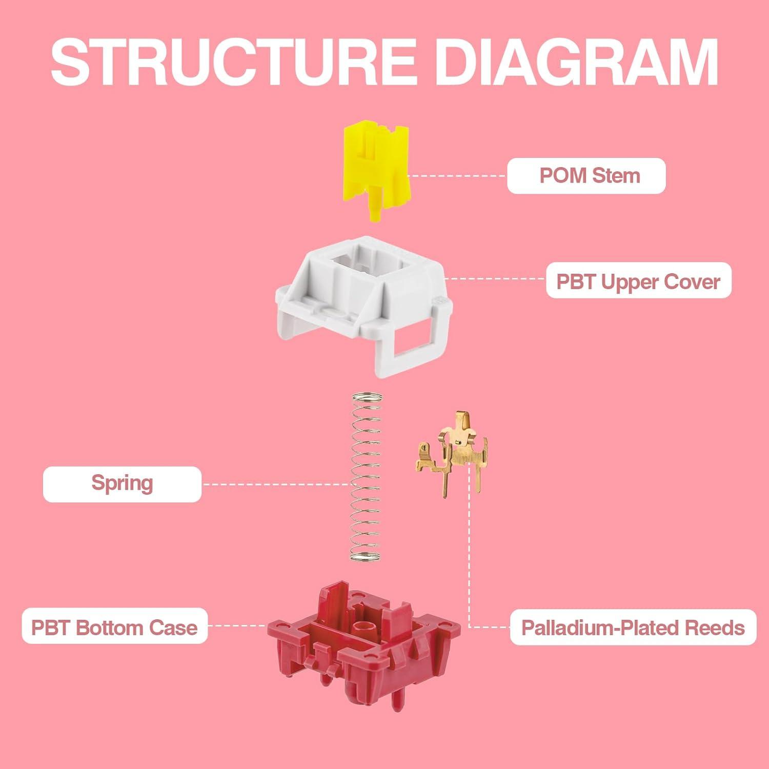 【COMPATIBLE WITH MX STRUCTURE KEYCAPS】The LEOBOG Nimbus Switches V3 are designed to be compatible with the general MX structure, fitting most keycap sets with an (X) cross stem. This feature enhances their versatility, allowing for easy switch replacement and keyboard customization.